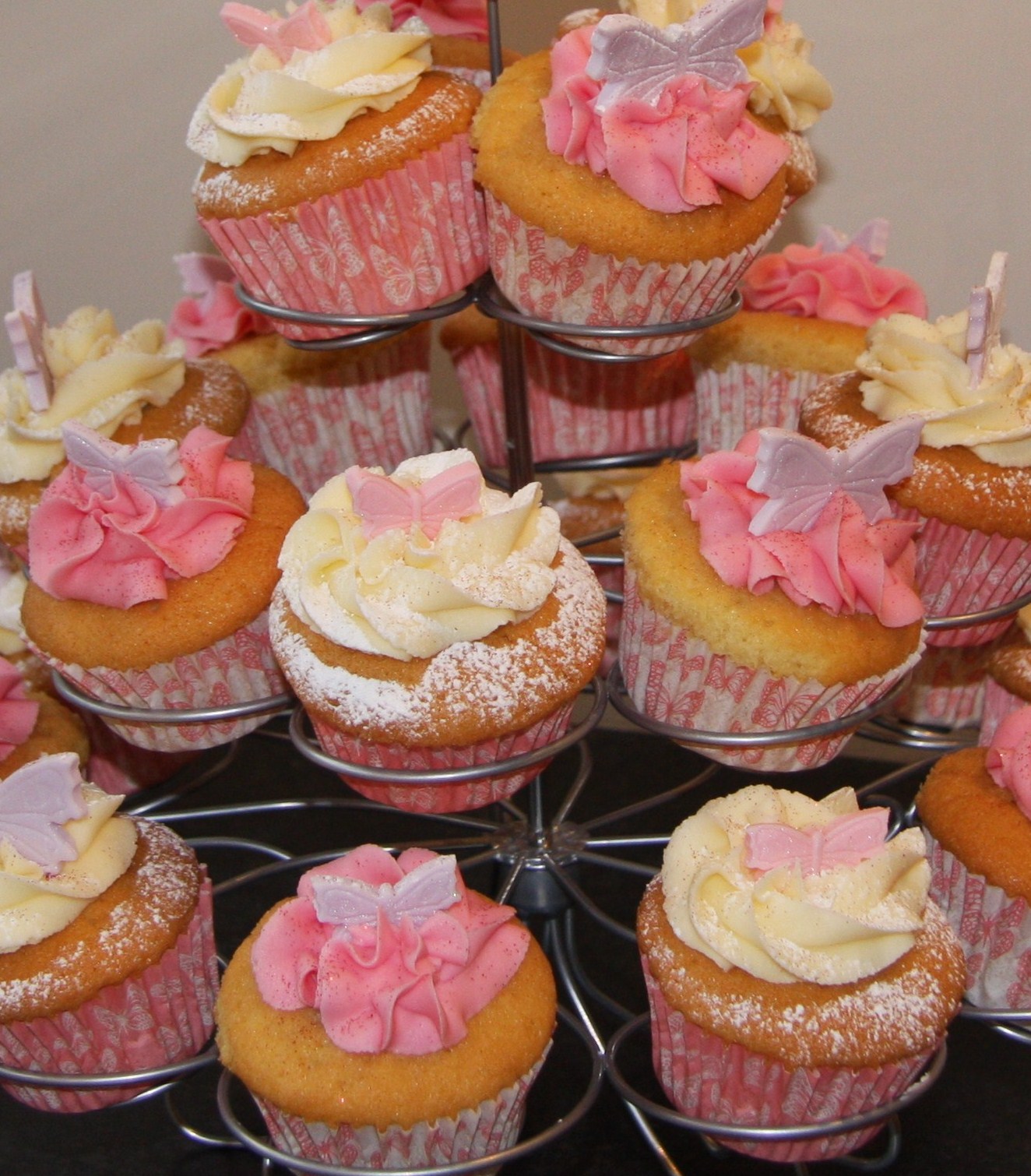 The birthday cake is a two layer vanilla victoria sponge sandwiched with pink buttercream, covered in white sugarpaste. The pretty butterflies came from some previous bartering; another friend wanted to make a cake for her eight year old and asked for a lesson in decorating it. So in exchange for a cup of coffee I helped her out and afterwards she gave me the butterflies she had bought for it. The decorations are cut out from sugarpaste. I cut some more out and let them set hard to use as a topper for the cupcakes and dusted them with silver metallic effect powder. The cupcakes are also made from vanilla victoria sponge with vanilla buttercream. I alternated the cake case colour with the icing colour and sprinkled icing sugar over some of them and red glitter over all of them. What 5 year girl old can have a party without some glitter?