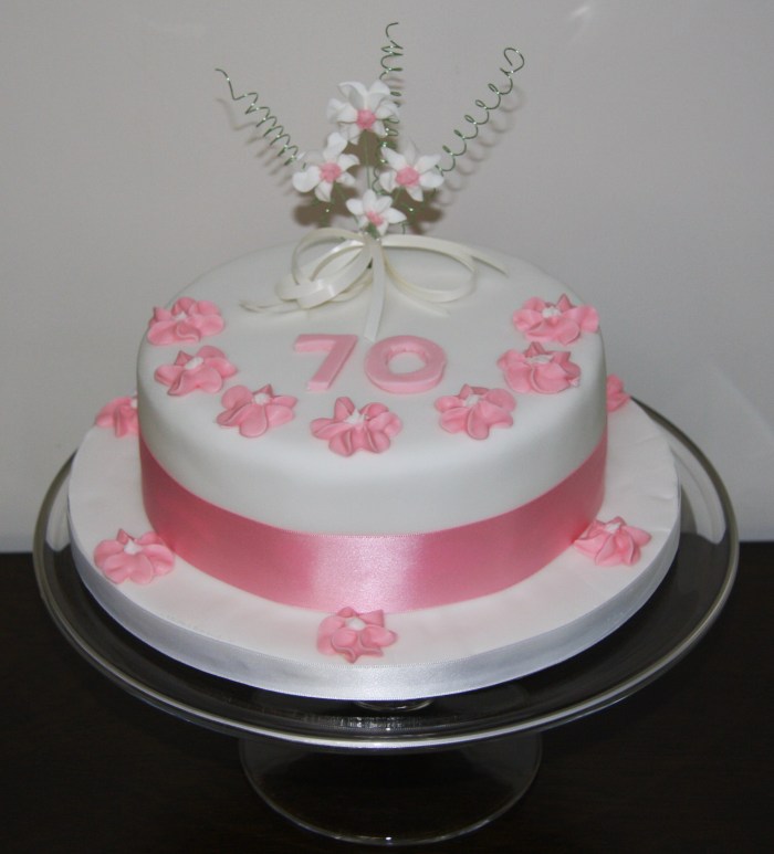 So I made her mother this three layer vanilla sponge, sandwiched with jam and buttercream and iced with sugarpaste. The flower decorations I made with royal icing and floristry wire and the 70 I cut out from sugarpaste; ribbon finished it off.
