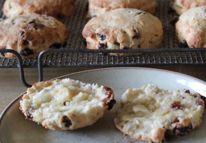 Sunday afternoons sometimes need a nice cup of tea and a sweet treat to make them complete, particularly as the weather starts to change and become more autumnal. Fruit scones were very much a “go to” recipe for a quick treat when I was a child but apart from the recent afternoon tea I was treated to, I haven’t had them for ages. I definitely haven’t made any for a long time. If you are looking for something quick, easy and not too sweet, scones are perfect. In fact the scones were ready and sitting on the baking tray before the oven had even reached the right temperature. And as they are best warm with melted butter you don’t even need to wait for them to cool down.