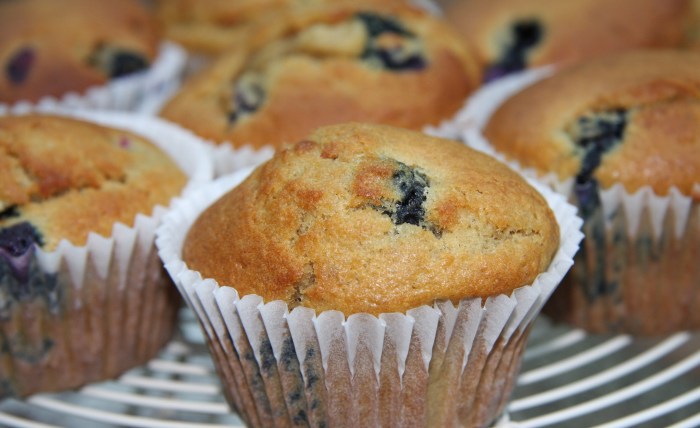 Combine the flour, baking powder, bicarbonate of soda, nutmeg and sugar and set aside. Whisk the eggs, milk and butter together and add to the dry ingredients. Mix well and fold in the blueberries.