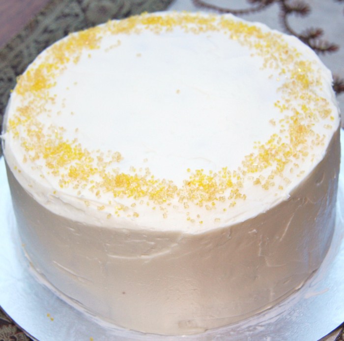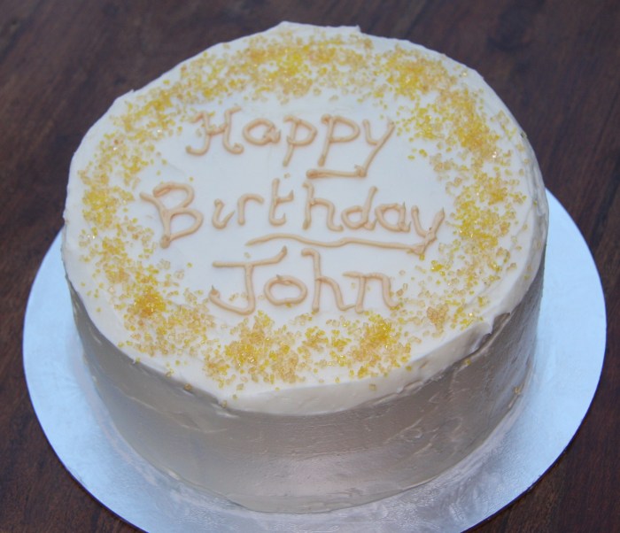 As this was a birthday cake I sprinkled yellow and orange sugar sprinkles around the sides and added a happy birthday message: