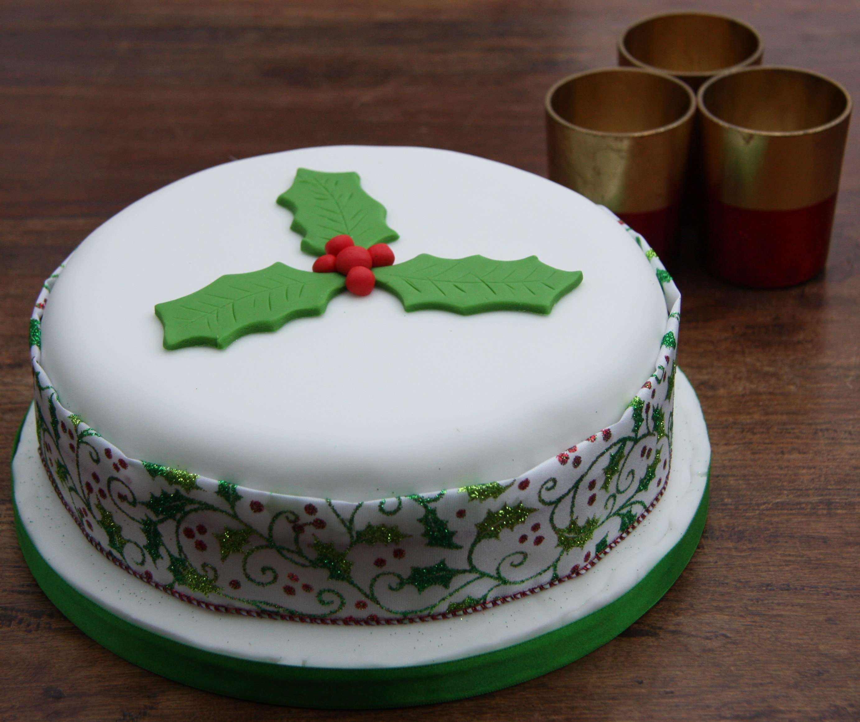 Then I left it again before realising that it was nearly Christmas and I hadn’t remembered to ice the cake… Luckily I had already bought some green and red icing and a Christmas ribbon for the sides, although I had overestimated the height of the finished cake and had to fold the ribbon to get it to fit. I wanted a really simple design and had seen a lot of holly and berry designs that I liked and already happened to have a holly biscuit cutter in a set of Christmas cutters I have had for years.