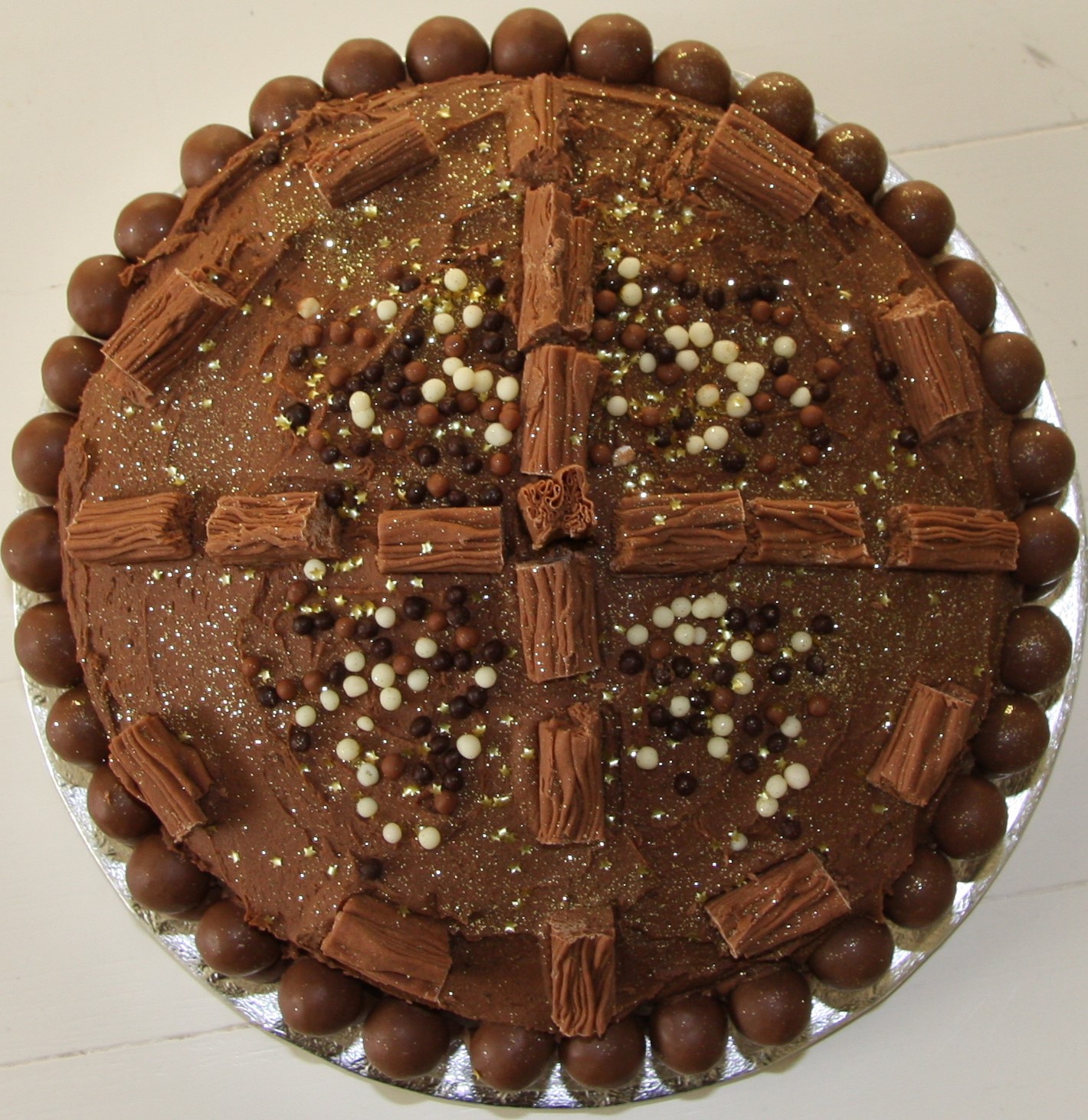 I used Flakes to decorate the top of the cake and then sprinkled some crunchy chocolate balls over the middle. I thought it needed a bit of glitz so finished it off with some edible gold stars and glitter.