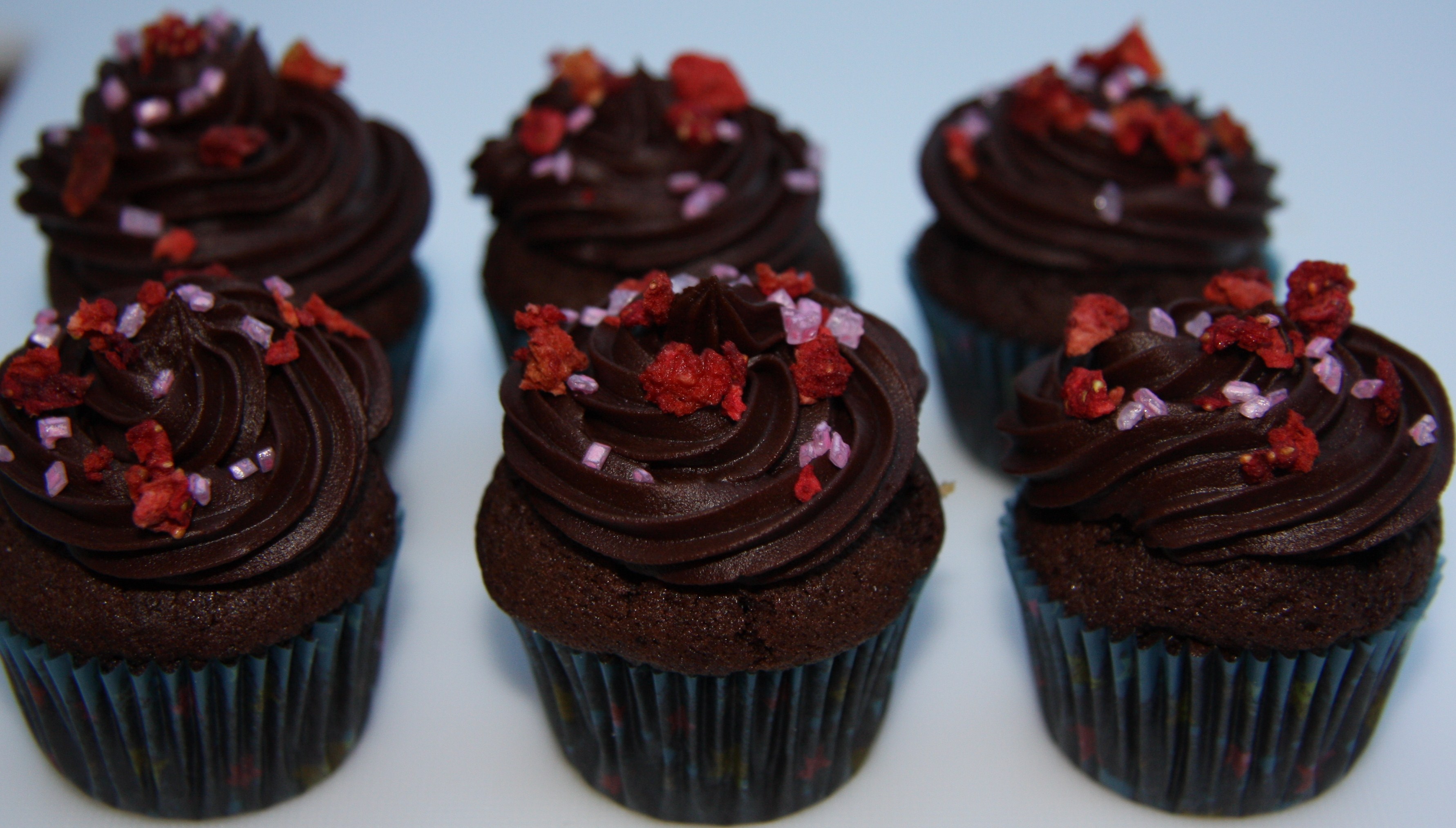Chocolate cupcakes with chocolate icing, topped with strawberry pieces and pink sugar for a bit of extra sparkle.