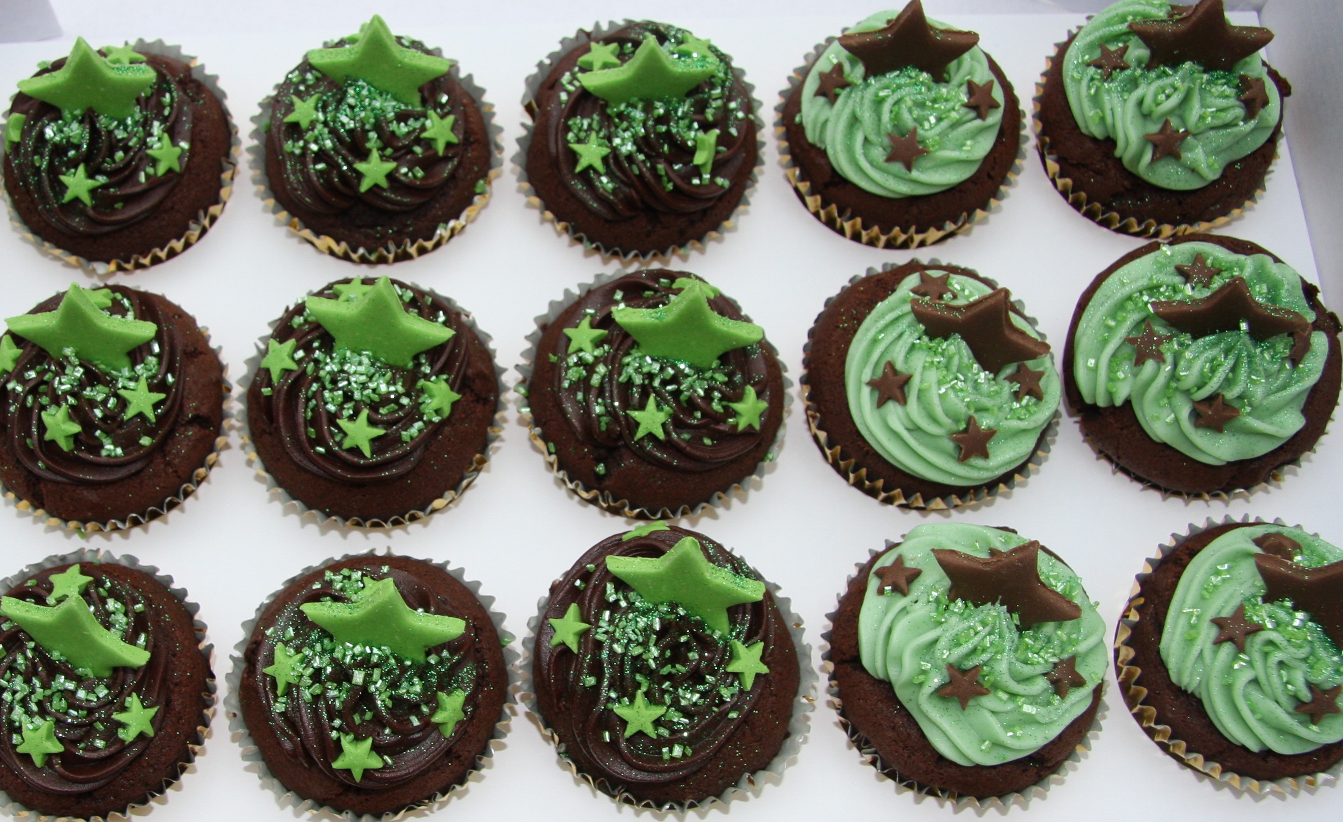 So we thought a mixture of chocolate and vanilla cupcakes would be a good idea and I did a mix of cupcakes and icings: chocolate topped with chocolate; chocolate topped with green vanilla; vanilla topped with green vanilla and vanilla topped with white vanilla. And a contrasting mix of green and chocolate stars including vanilla cupcakes with green icing and green stars for those children who really insist they don’t like chocolate. And they were all finished off with green sugar sprinkles and green glitter.