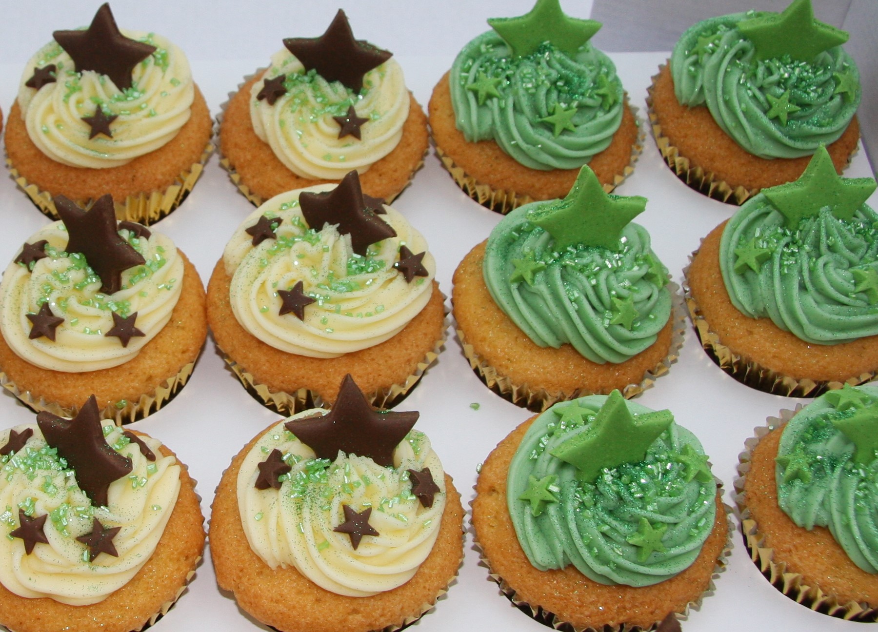I used my favourite vanilla and chocolate cupcake recipe and used gold cases to give them a party feel. I flavoured the buttercream with vanilla and cocoa, and coloured some of the vanilla a pretty green using a gel colour. I rolled out some ready made chocolate sugarpaste and coloured some white sugarpaste green and cut out large and small stars for the toppers. I used green sugar sprinkles and green glitter on all of the cupcakes to tie them all together properly and add a bit of sparkle.