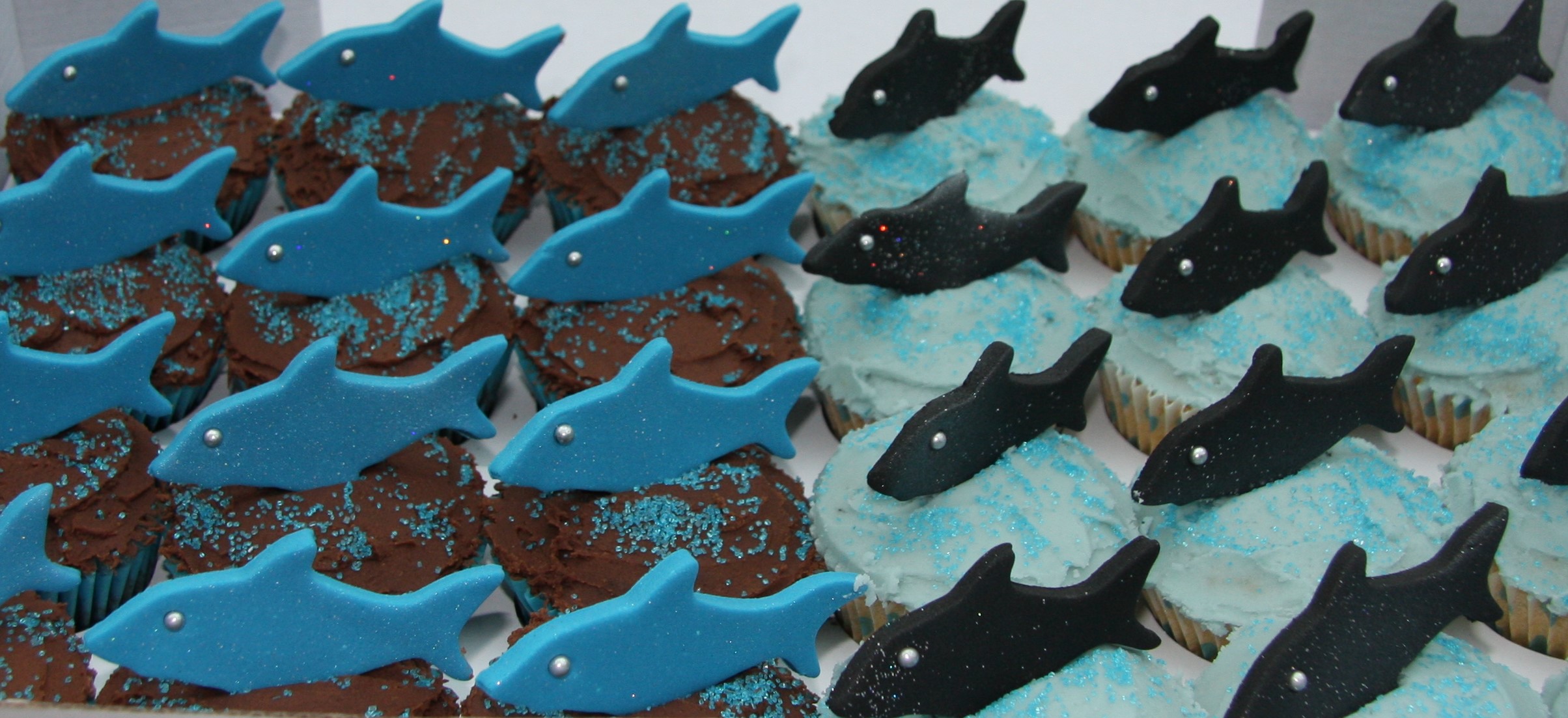 So I found a shark cutter on the internet and it turns out that sharks are far better for cupcakes than dolphins because the pectoral fin (yes, I did have to look that up) is perfect for sticking the shark into the cake, and it looks like it’s swimming.