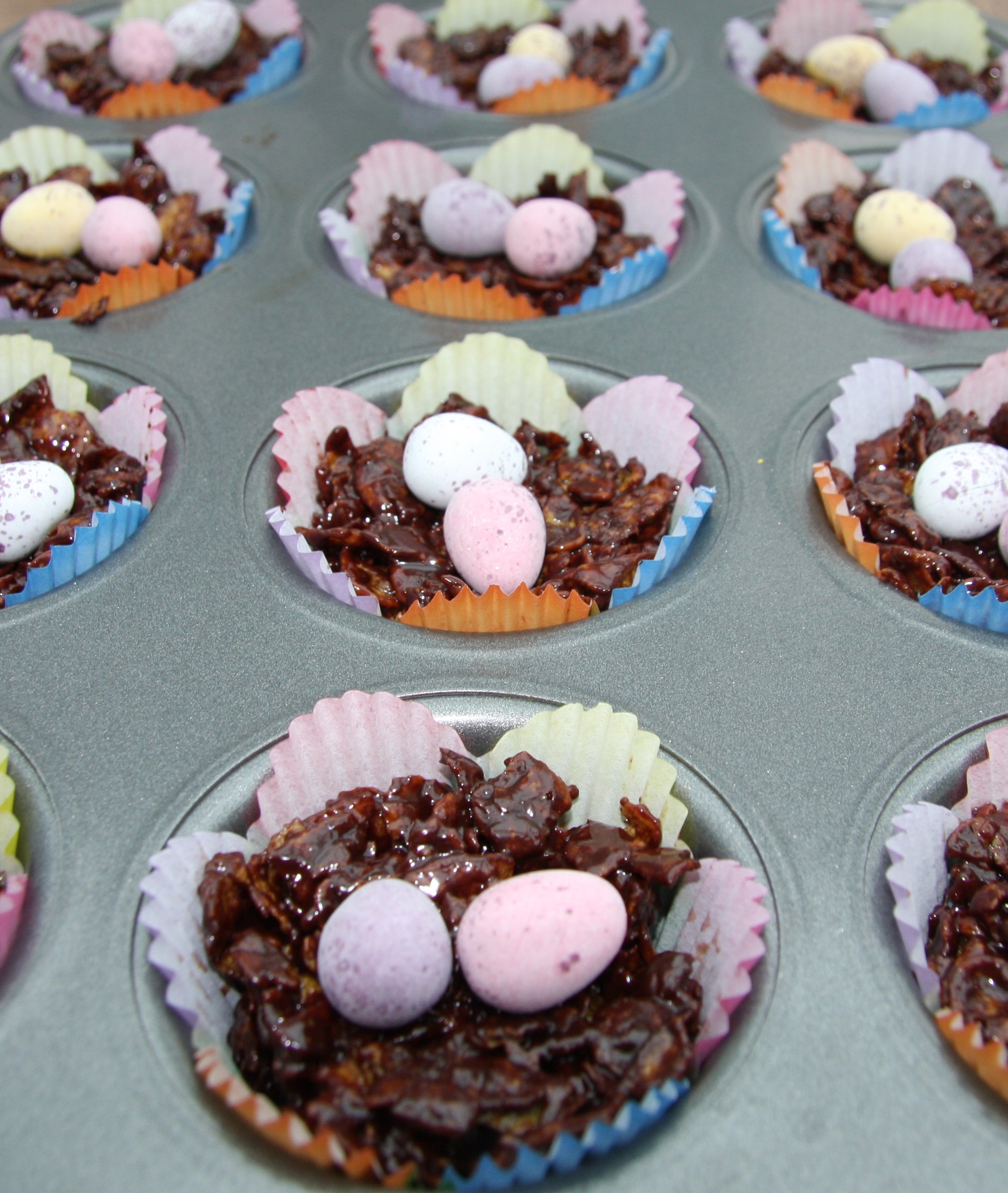 Spoon the mixture into the cake cases and push down well so that they stick together properly. You can make a dip in the middle to give a “nest” effect and add a few mini eggs to complete the look.