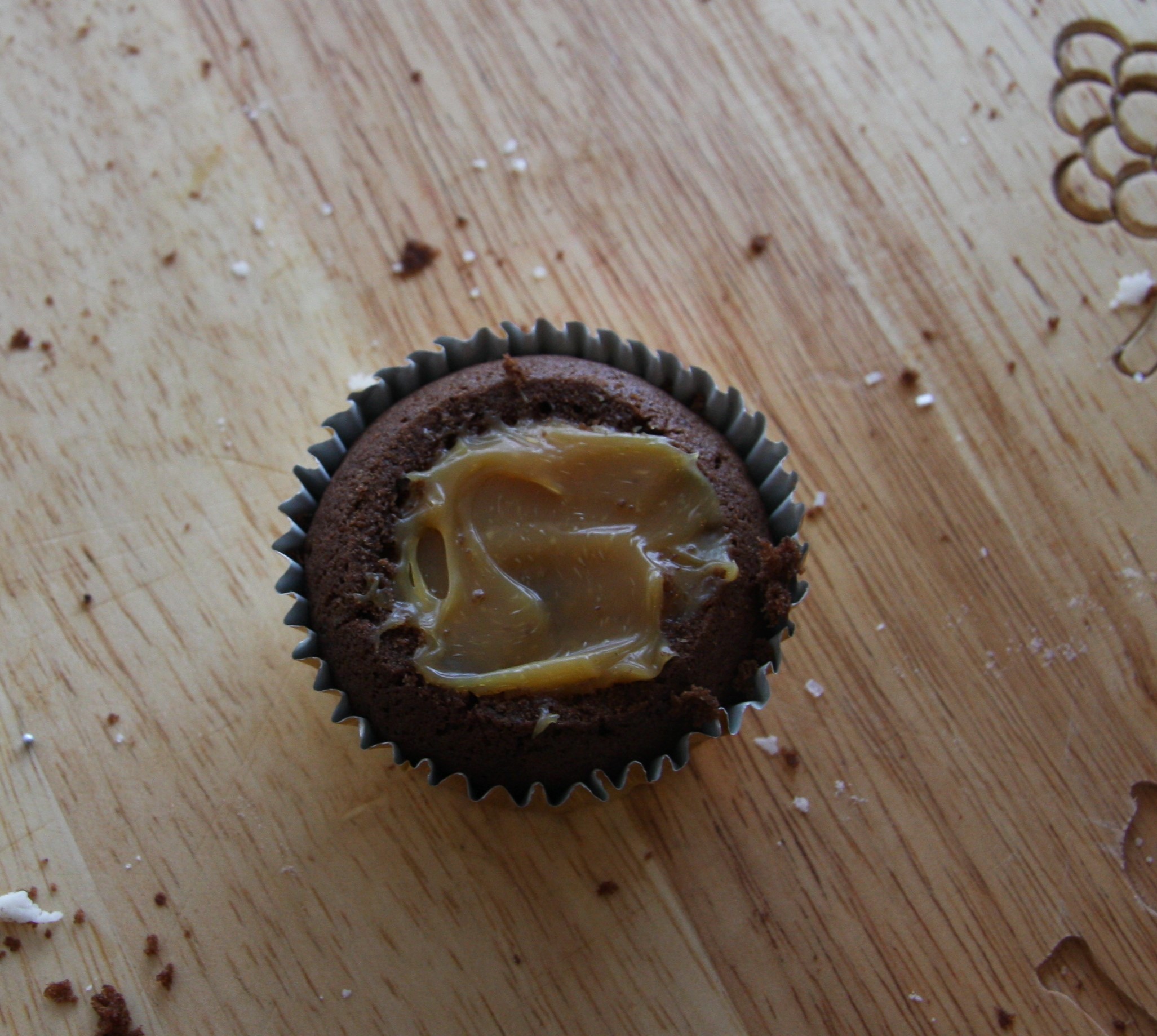 I used some of the cake I had removed to cover over the filling, iced them and sprinkled them. I didn’t remove a lot of cake as the caramel sauce is very sweet and rich. I still managed to get an extremely generous teaspoonful in each one. Don’t underestimate the amount of icing required: I had to make up another batch despite having made more than I thought I would need.