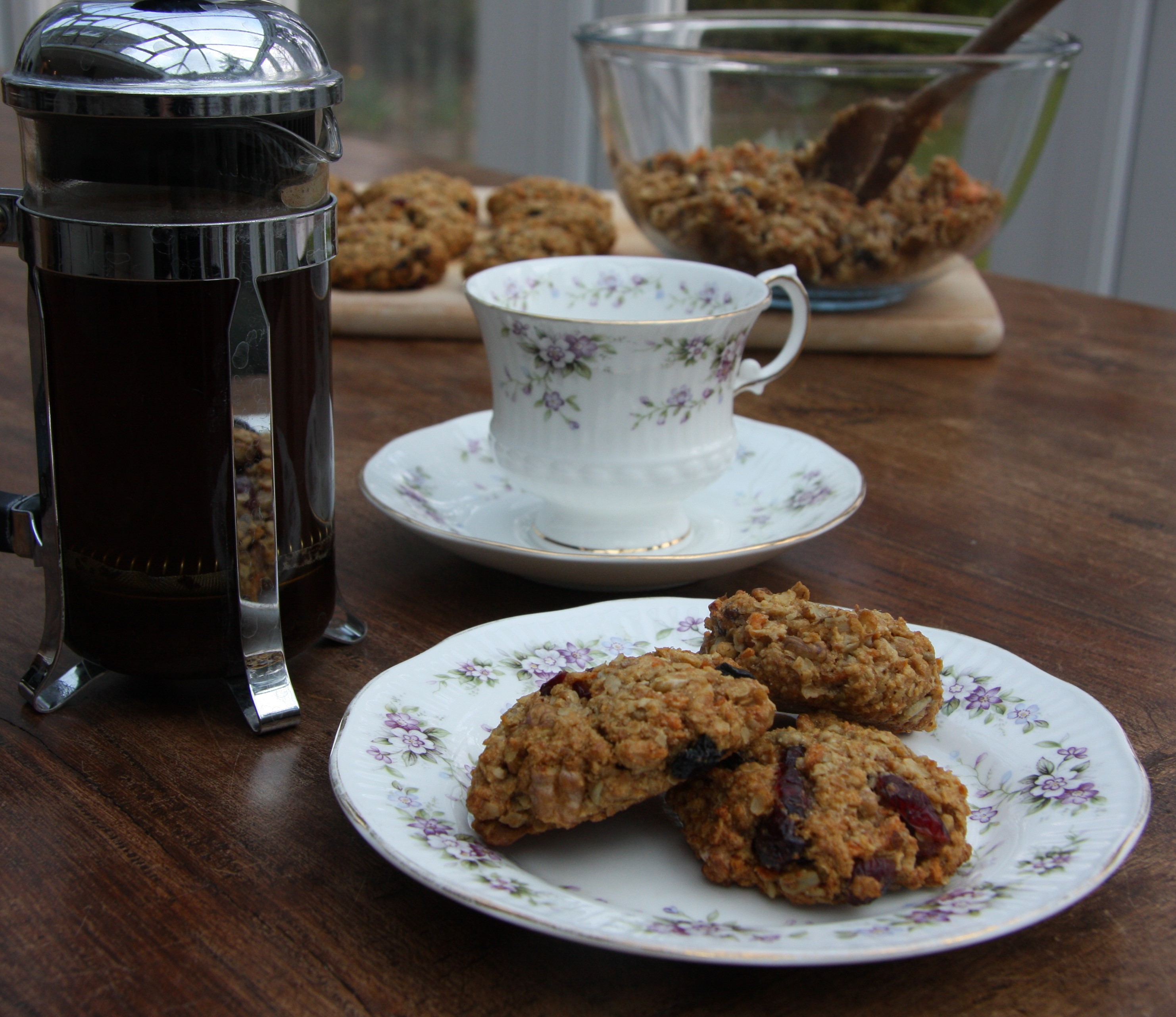 In the meantime, while waiting with baited breath until the end of April to see if I am featured, I will be enjoying the Breakfast Cookies. They are really easy to make, and as cookies go, relatively healthy. They are dairy, egg and wheat free (if you use spelt flour). They are full of dried fruit, seeds and nuts as well as carrots.