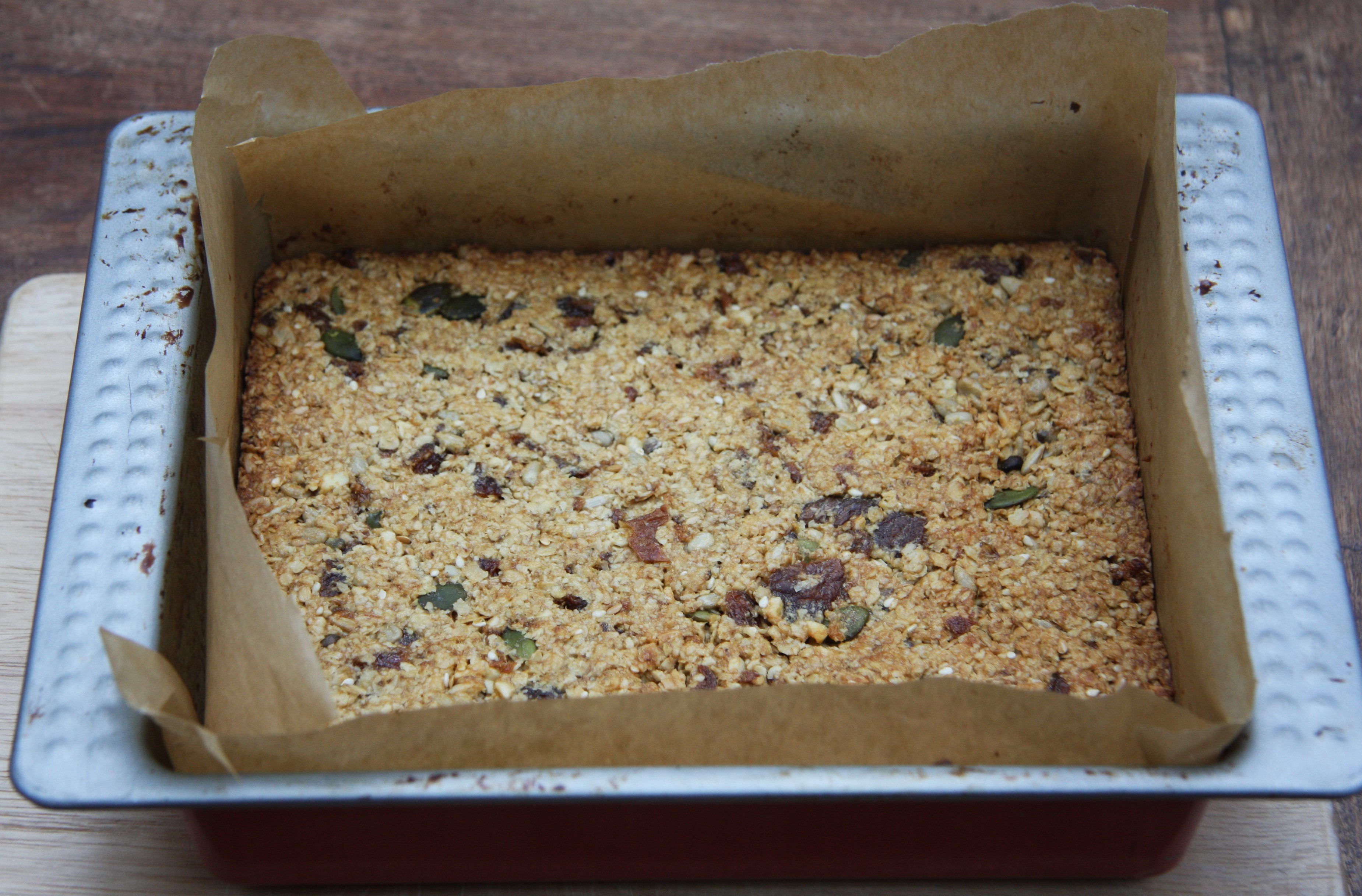 These are essentially flapjacks with a few healthy ingredients added for good measure: dried apricots, nuts and seeds. This weekend I will be walking 27 miles across the Isle of Wight for charity: if there are any of these left by then I will be taking some with me!