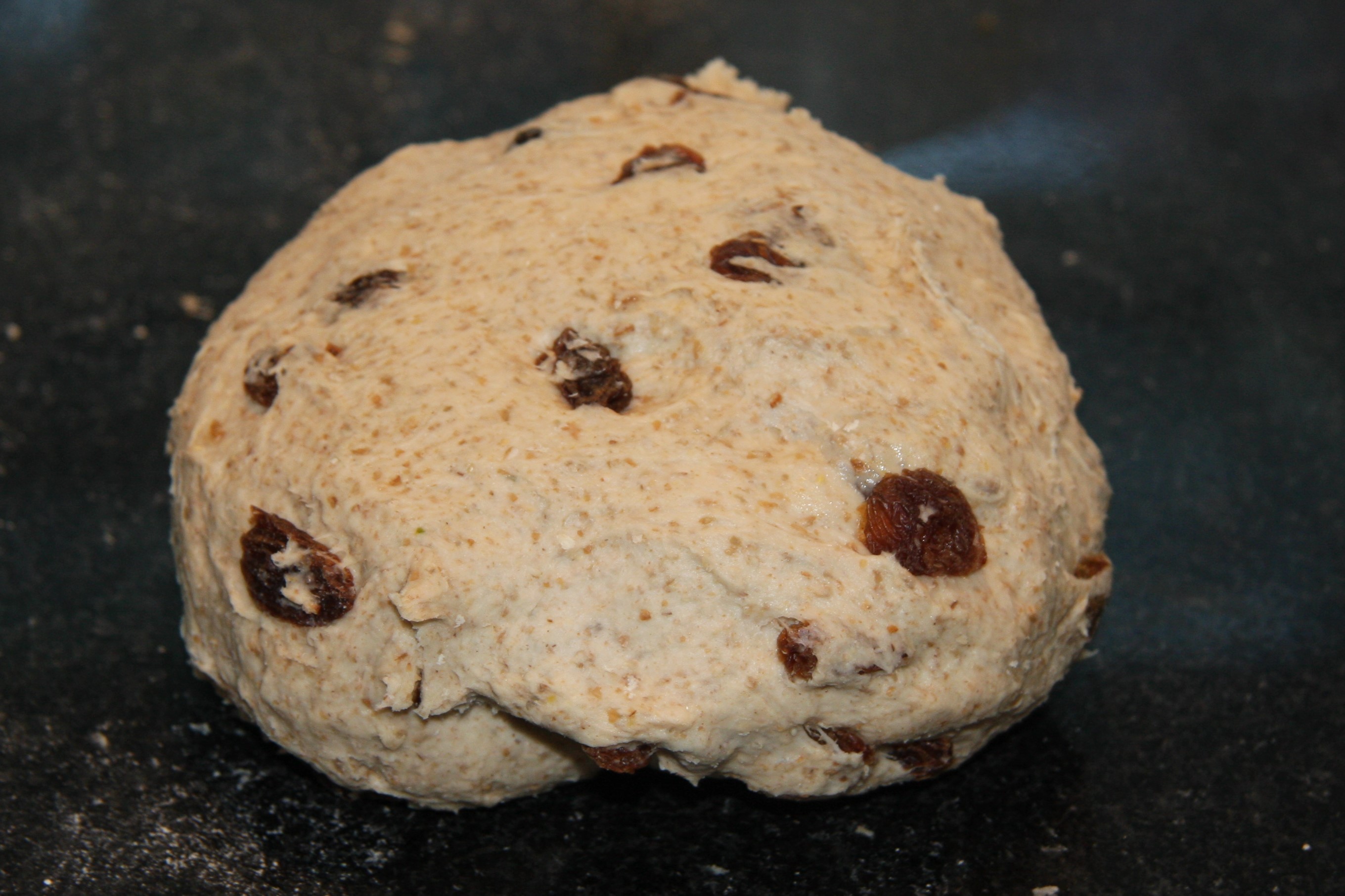 Add the raisins or sultanas and knead again until evenly incorporated.