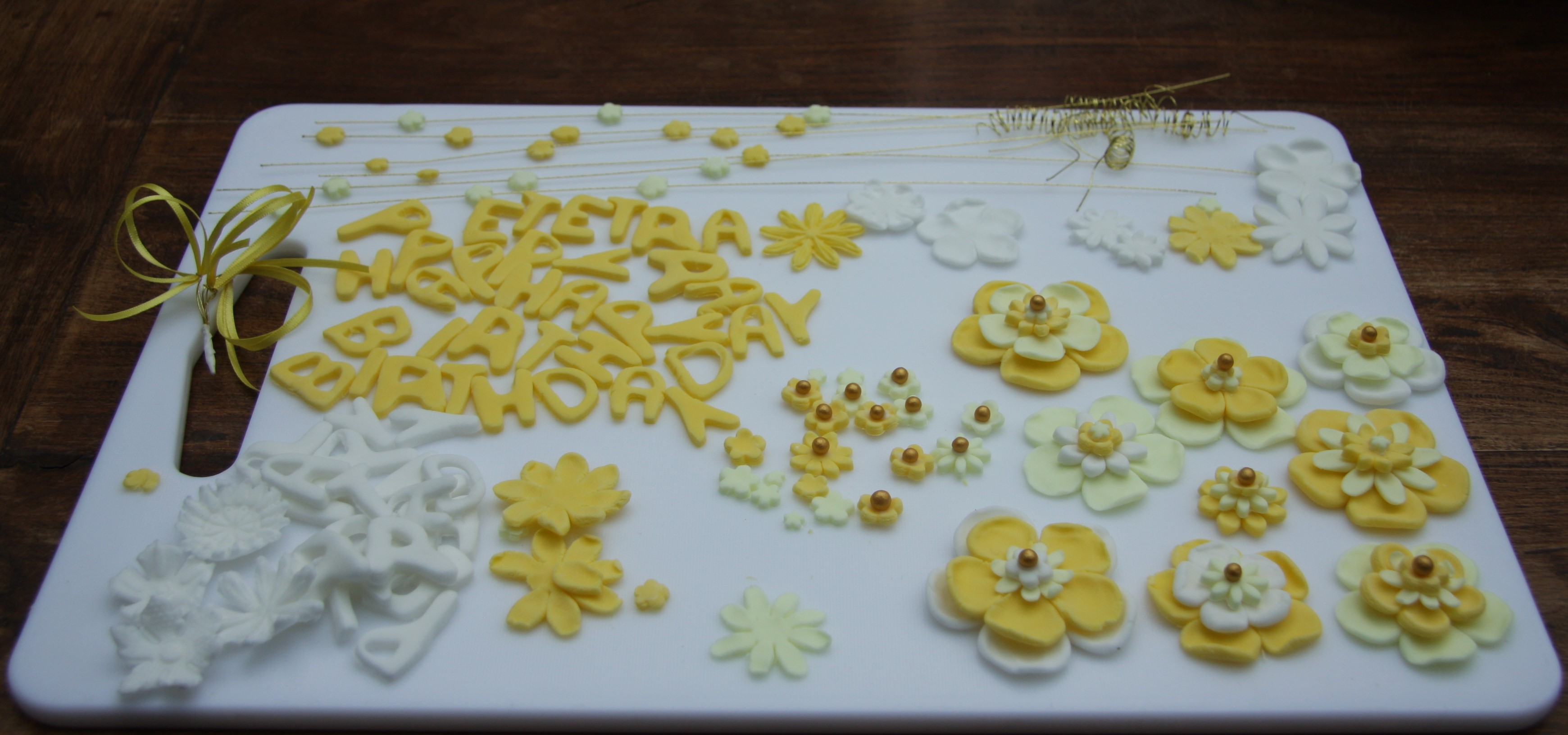 Using the template and practising with the white sugarpaste, it was possible to get an idea of what would look good and how many flowers would be needed. It was also easy to see that my new alphabet cutters would fit and I could play around with the layout.