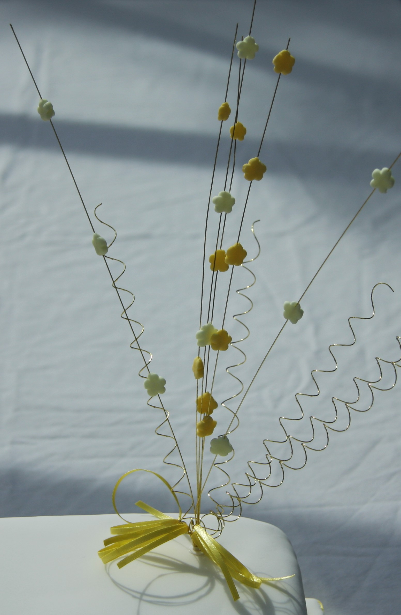 I also made some tiny flowers to thread onto gold floristry wire, secured them with a touch of water and tried to squash them onto the wire as much as possible while keeping their shape, in the hope that they would set and stay put. Having expected them to crack and fall off, or for the wire to be too delicate to hold them up, I was amazed at how well it worked.