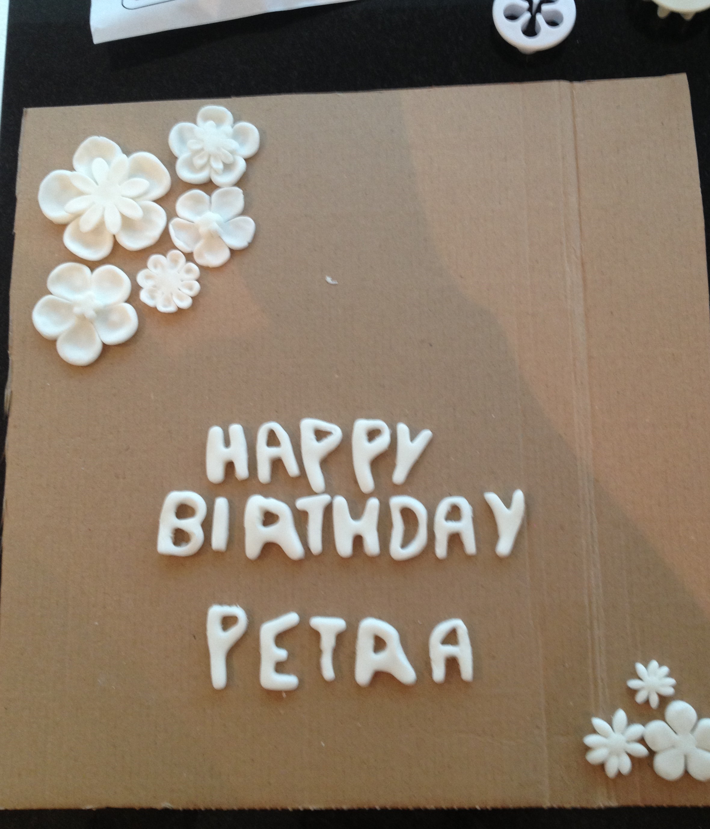Then on went the ribbon, the flowers, the Happy Birthday Petra and the topper and that part didn’t seem nearly as stressful as there was a plan to follow.