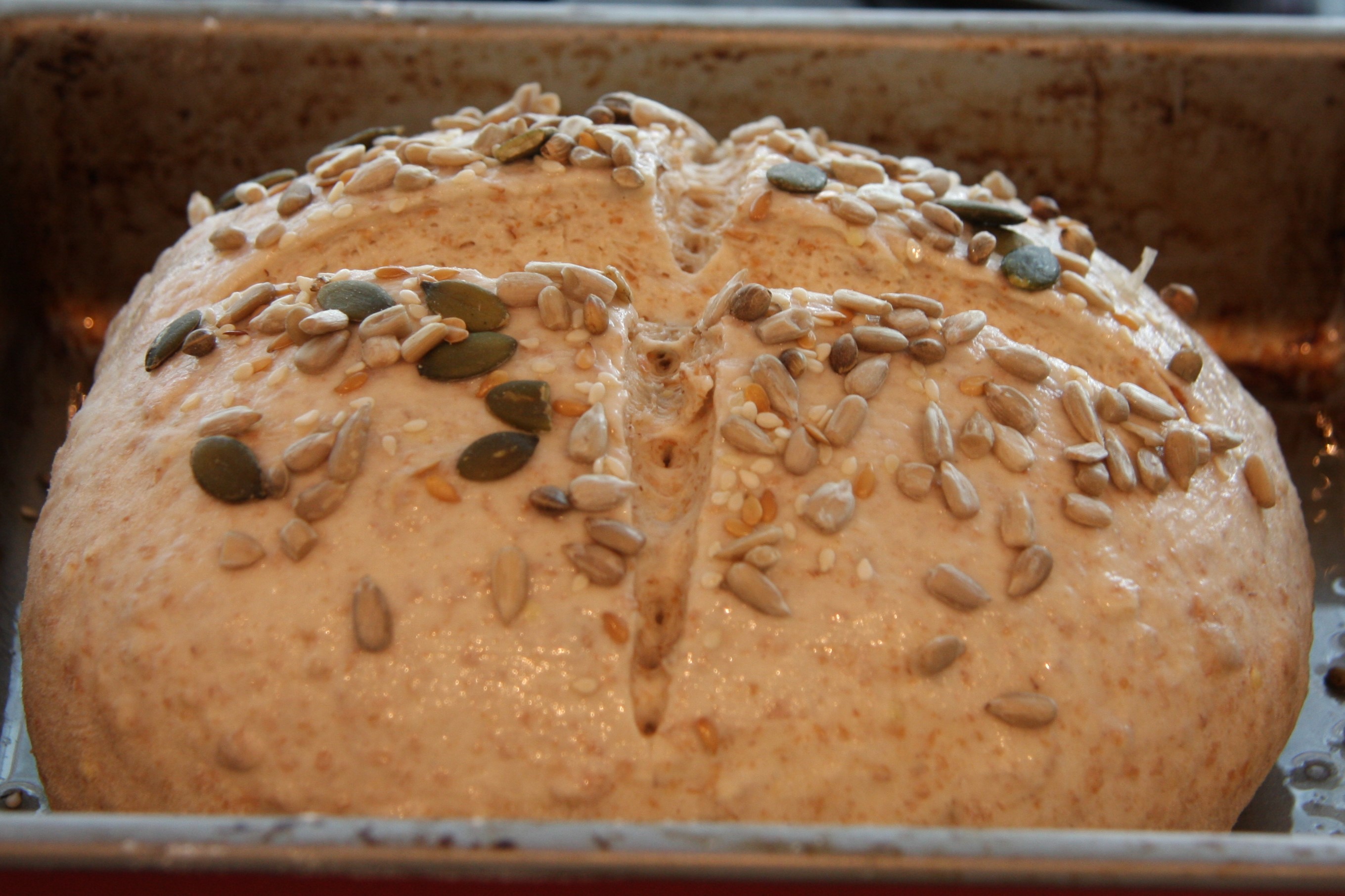 If you would like to use a topping or score the loaf, now is the time. Brush the top with water and sprinkle over some mixed seeds:
