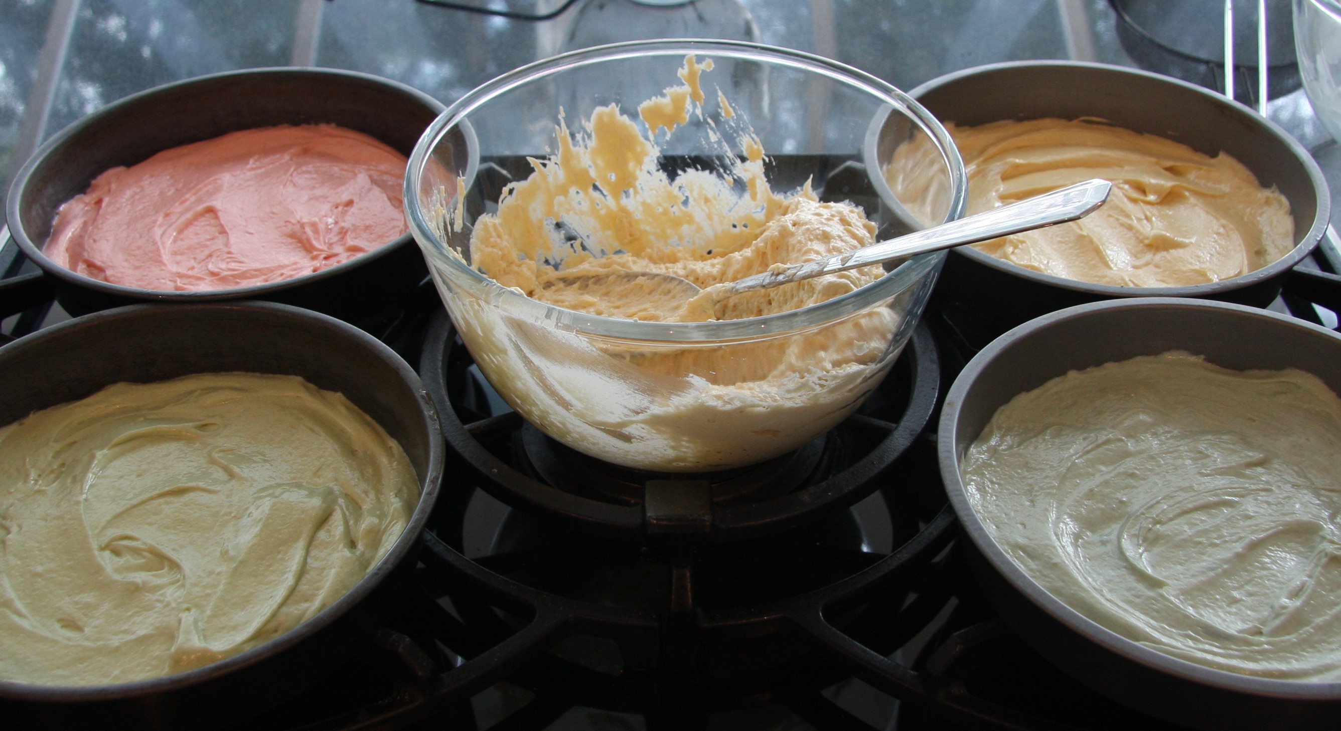 I then coloured each bowl with a different gel colour. I have four 8″ tins so I baked four of them and when they were done I did the last two.