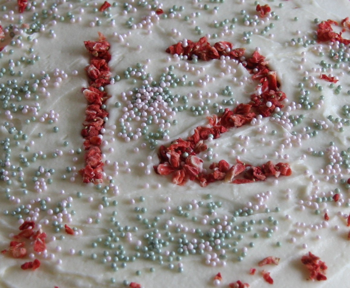 I used the wrong end of a teaspoon to mark out “12” and then carefully sprinkled freeze-dried strawberries into the little channels: