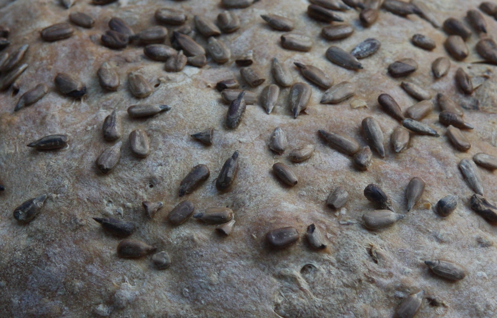 Shape the dough and put it into an oiled tin or onto a floured baking sheet. Brush the top with water and scatter sunflower seeds over the top.