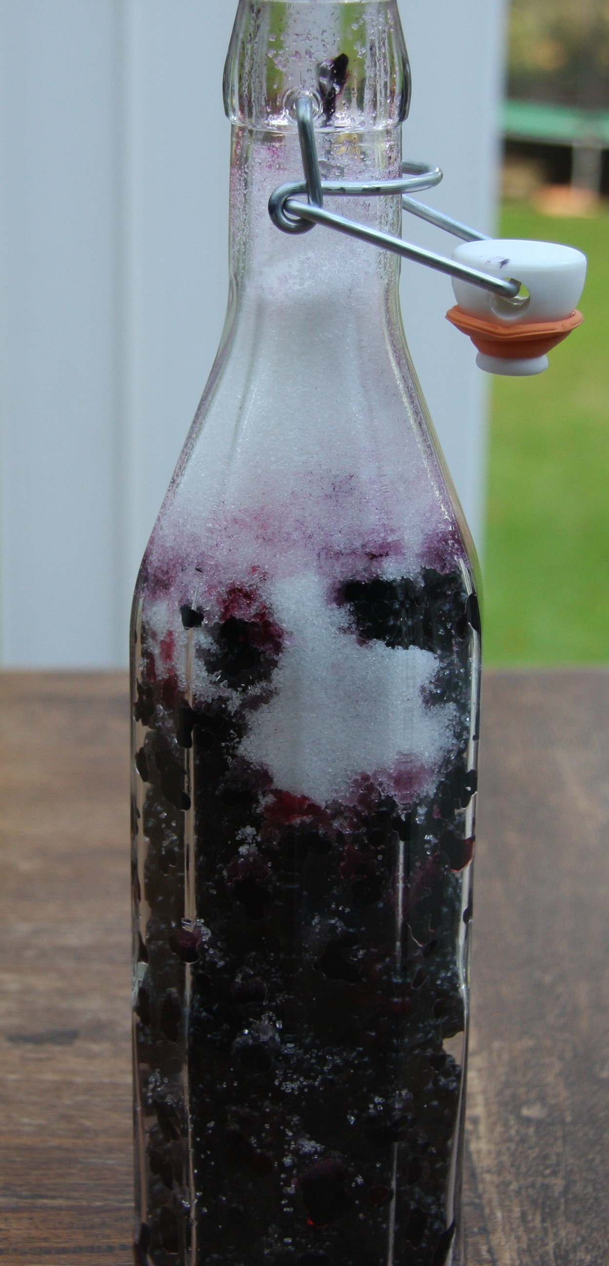 For a litre bottle you will need a 2lb/1kg bag of sugar. Add as much sugar as you can to the bottle. I used a funnel and kept shaking the bottle and pushing the blackberries and sugar down to get as much in as possible: