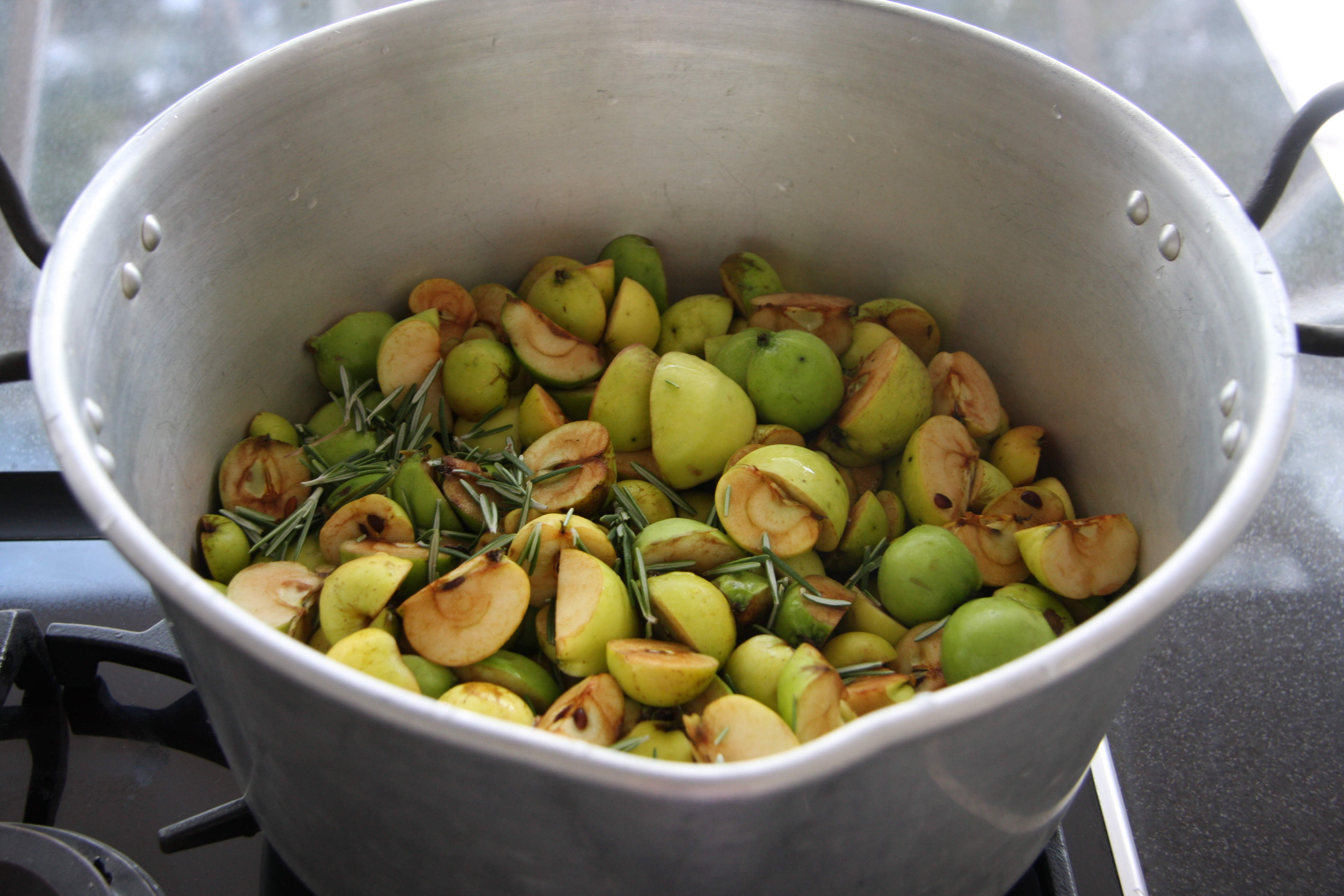Crab apples are very easy to use as they only need chopping up: they do not need peeling or coring. If they did I doubt anyone would bother… As they cook they get very pulpy and seem very starchy. They are high in pectin so you can use them with fruits that are lower in pectin to make jellies. They really don’t look appetising but the juice extracted makes good jelly!