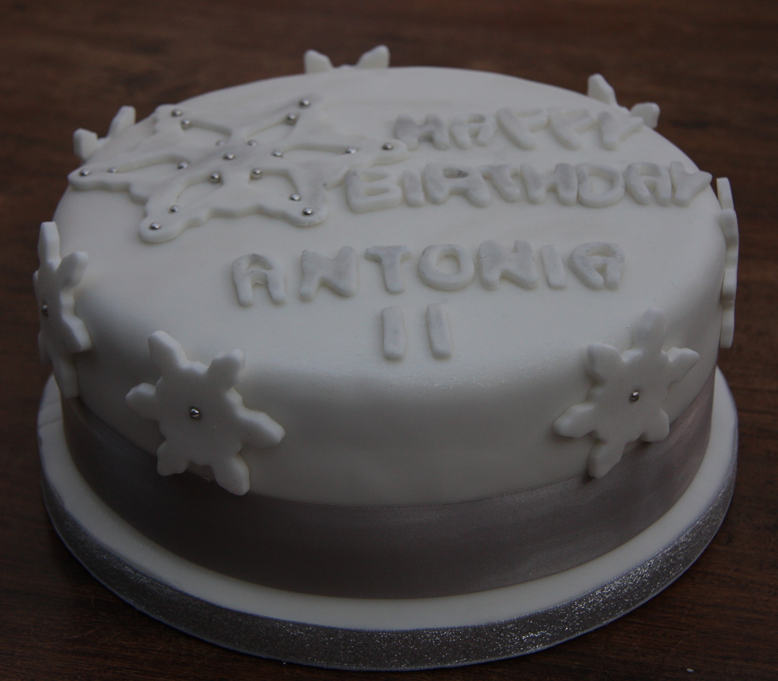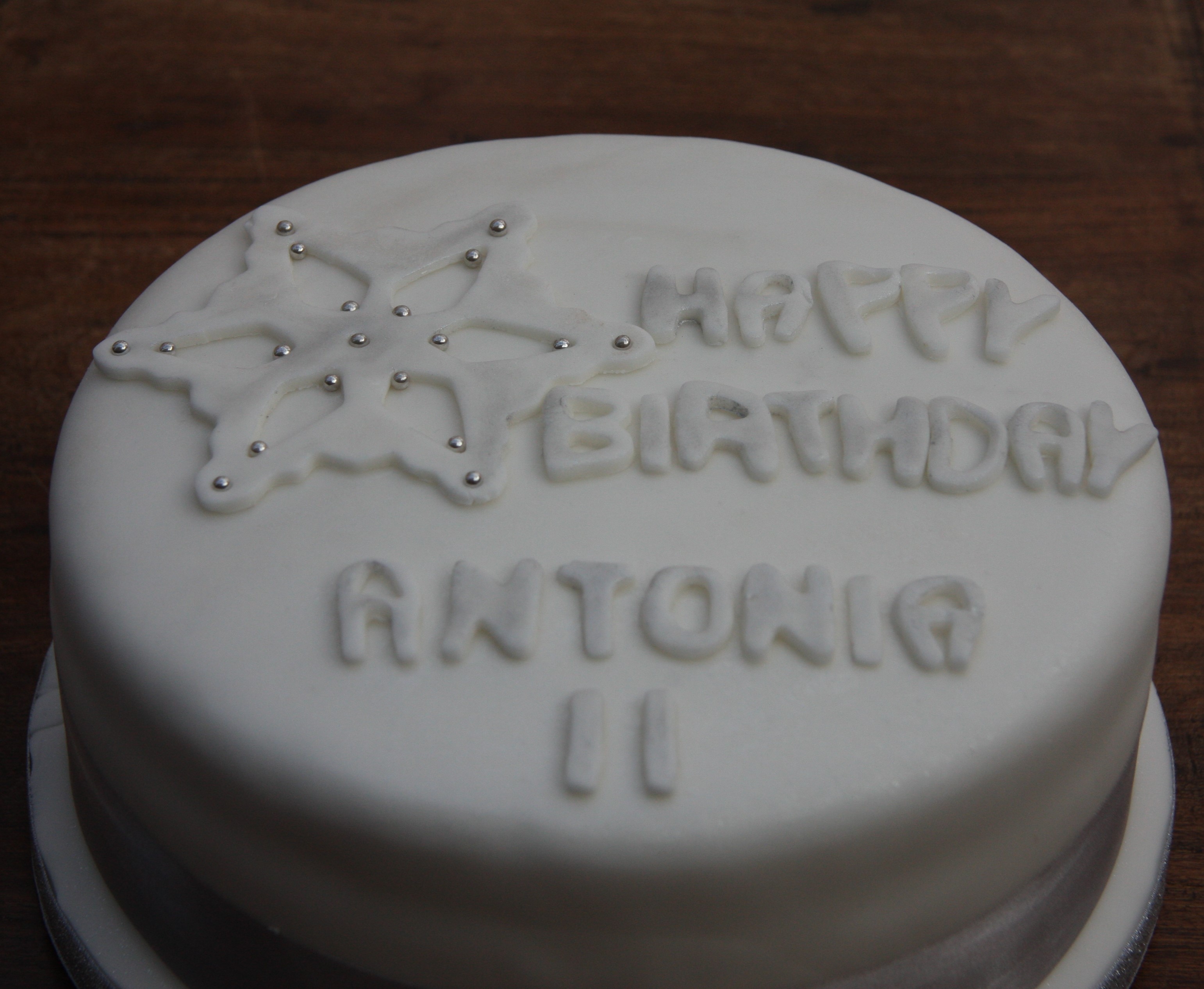 Then it is just a question of building up the snowflake design. I wanted a snowflake on top and added the silver balls to give a bit of definition and glitz. I used silver dust on the white icing for the writing so that it would stand out from the white cake and tie in with the silver ribbon.