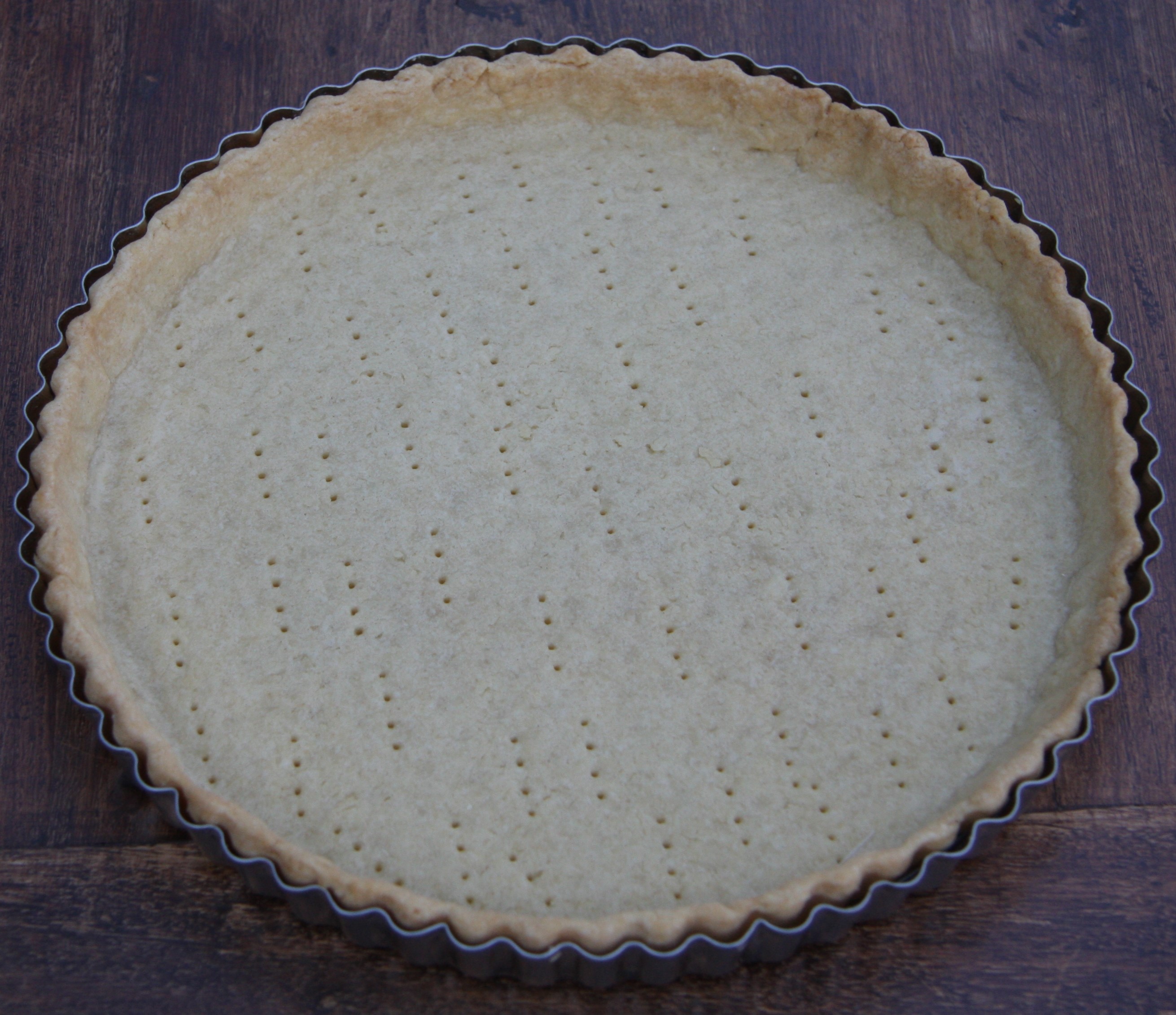 Set the oven to 190ºC. Line the pastry case with greaseproof paper and fill with baking beans or rice. Bake for around 15 minutes, until the pastry is firm, then remove the baking beans and cook for about five more minutes, until golden brown.