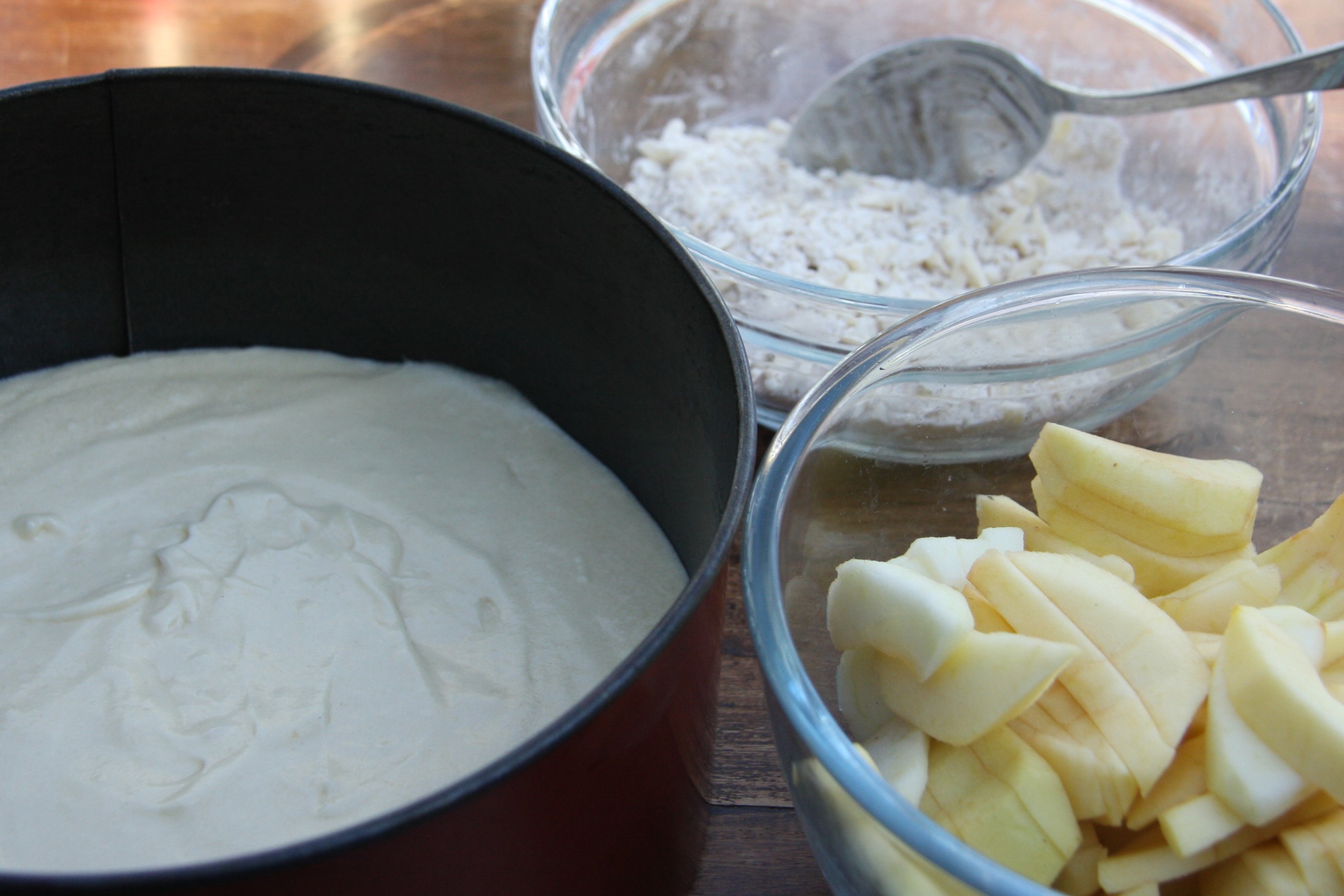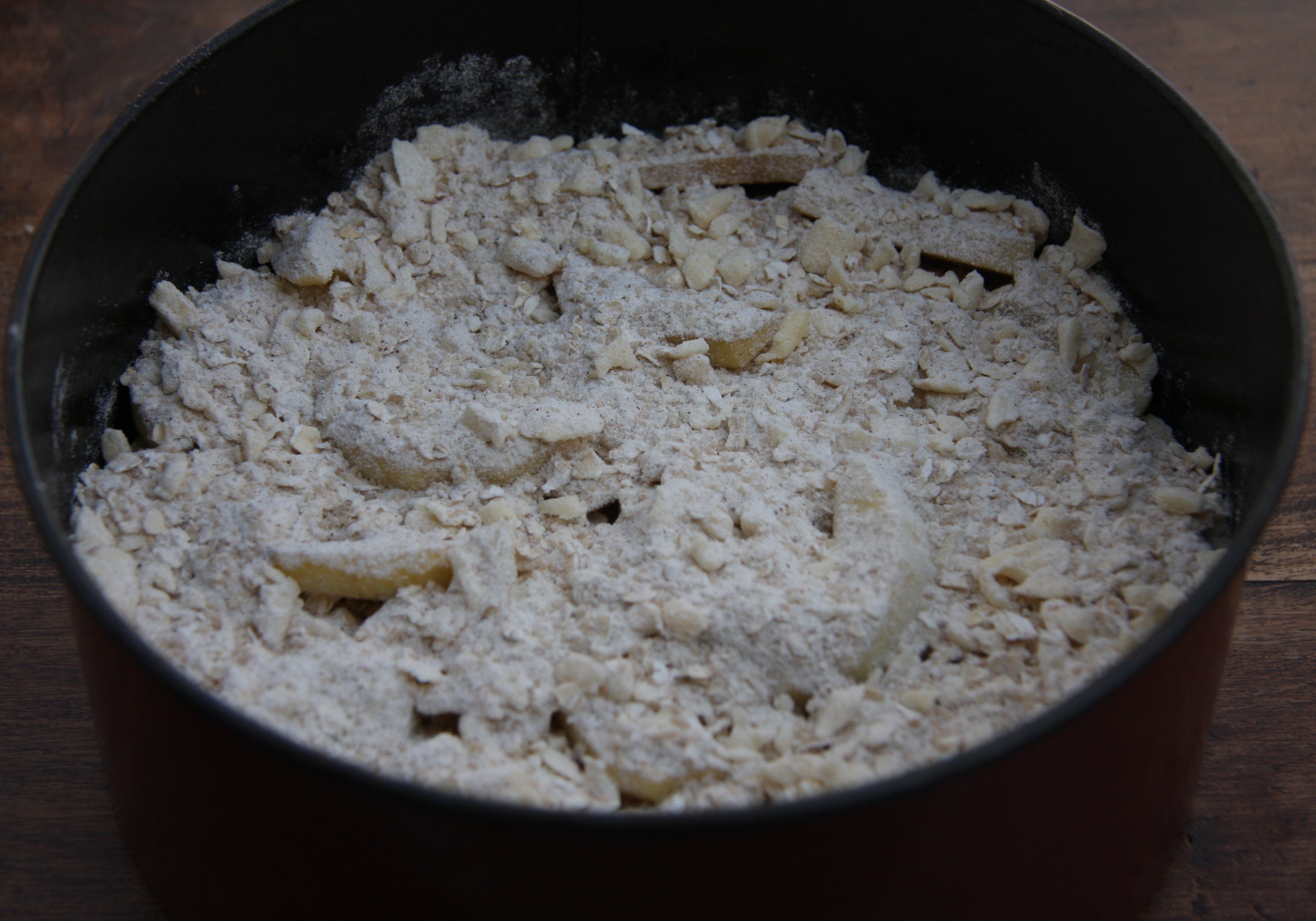 Finally I have managed to use up the last of the apples that my friend Vana gave me before Christmas. They really weren’t looking good enough to eat on their own so I thought an apple crumble, or streusel cake might be good. It’s a cross between cake and dessert and works well as either. Or both, depending on how much you have left after the first serving!