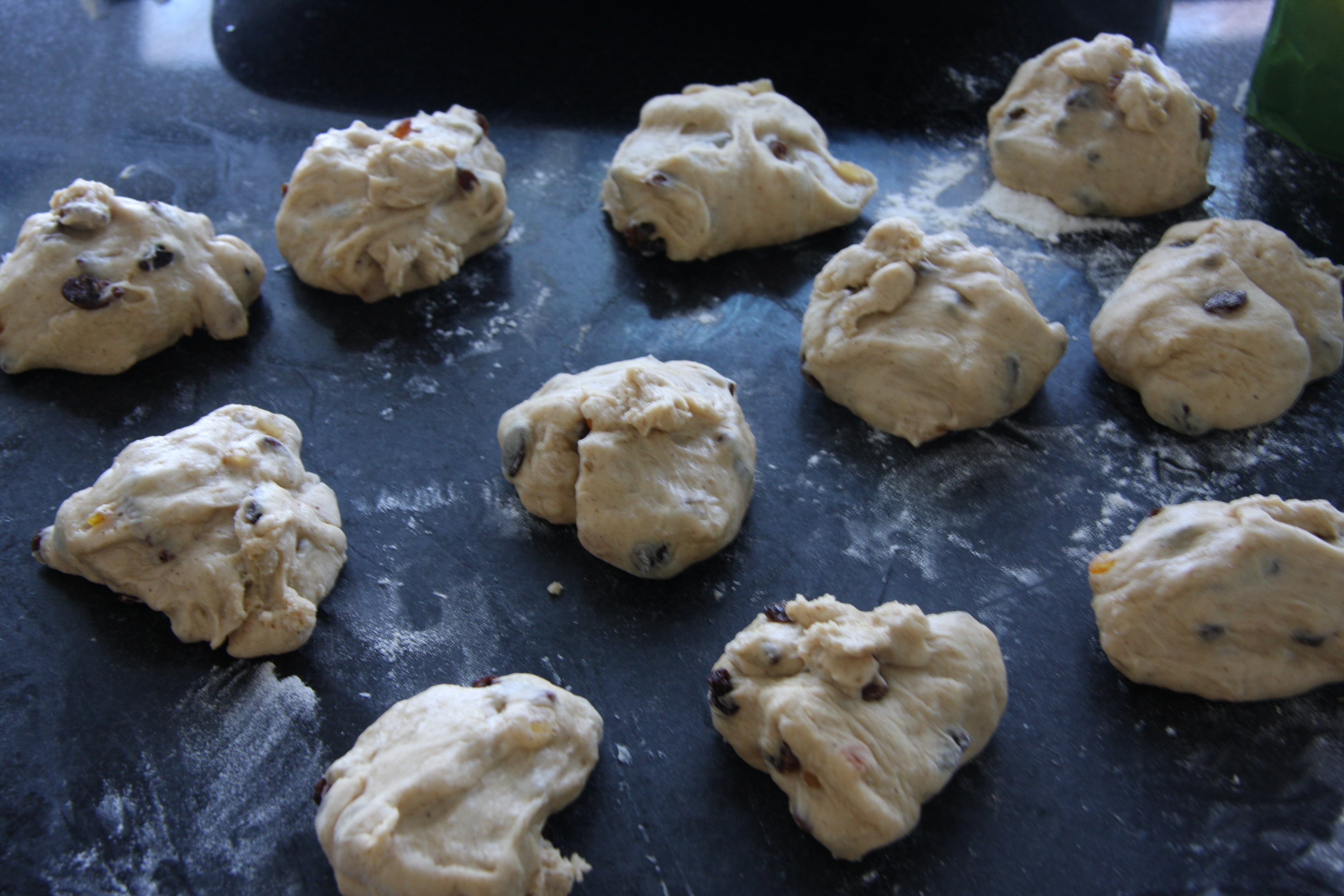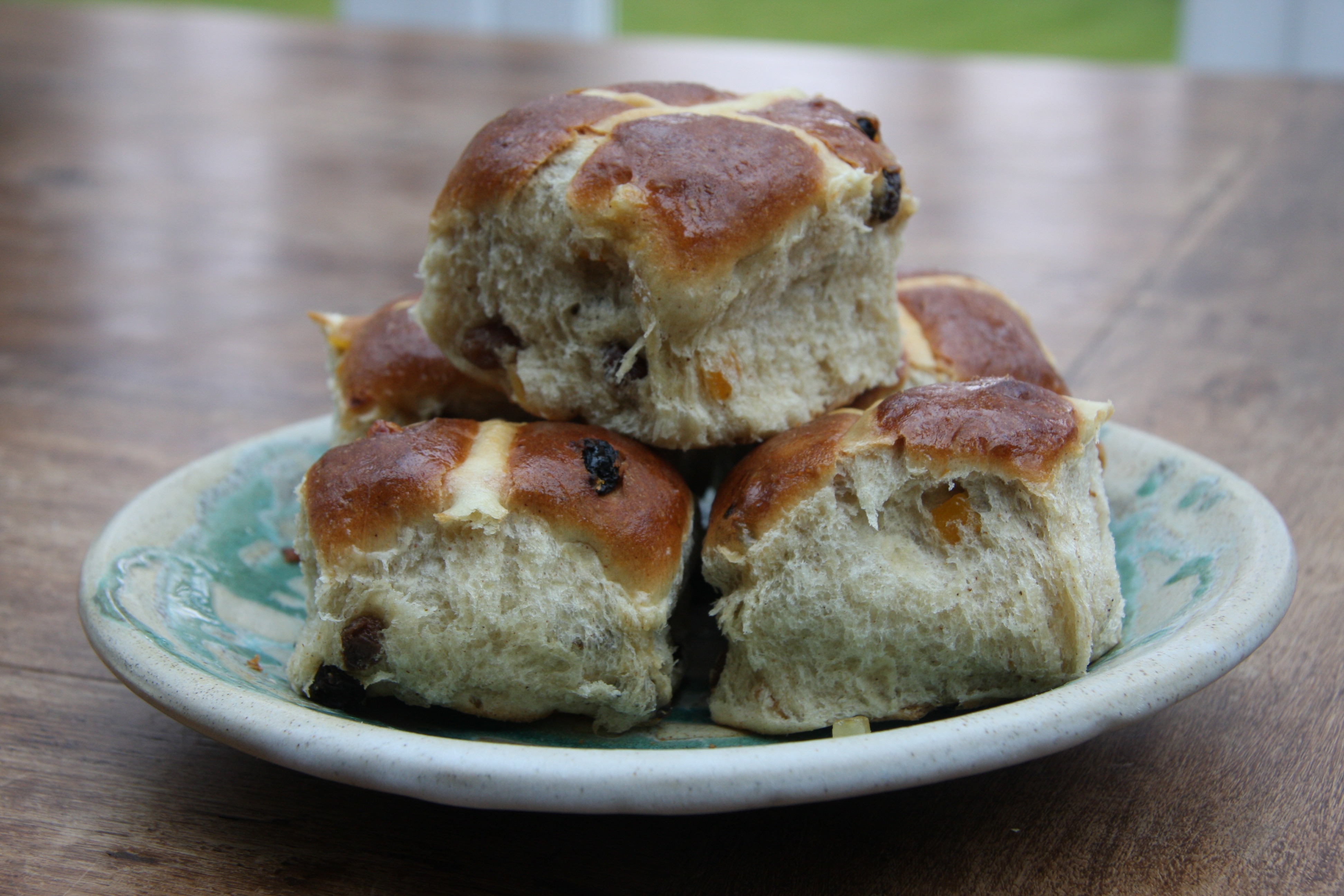 There are a lot of amazing Hot Cross Bun recipes out there and I have sampled several delicious variations (my favourites involve cranberries, orange or chocolate) but every year at Easter I really look forward to them in their traditional incarnation, with mixed spice, mixed peel and raisins (or sultanas). Maybe I’m a traditionalist at heart. I have had a couple of attempts at making them this year. The first time I changed my mind and tried an Iced Cinnamon Swirl Loaf instead. It wasn’t entirely successful. The second time I realised once I had started that I didn’t have any mixed spice or mixed peel. So they were more of a un-crossed cinnamon and sultana bun. Still good, though.