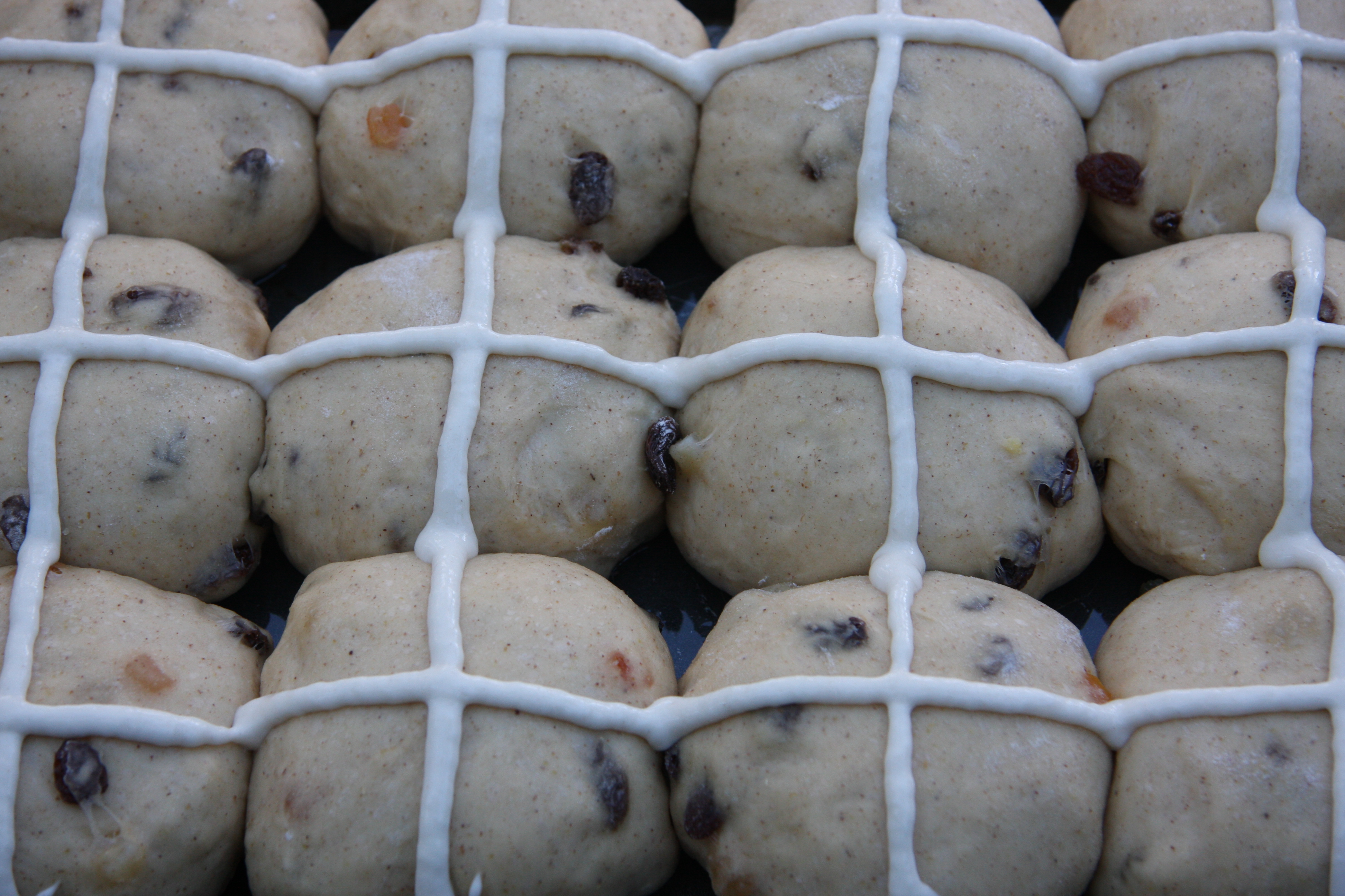 Make the paste for the crosses by mixing the flour with enough water to make a smooth paste the consistency of toothpaste. Put the paste in a piping bag and pipe a cross across the tops of the buns.
