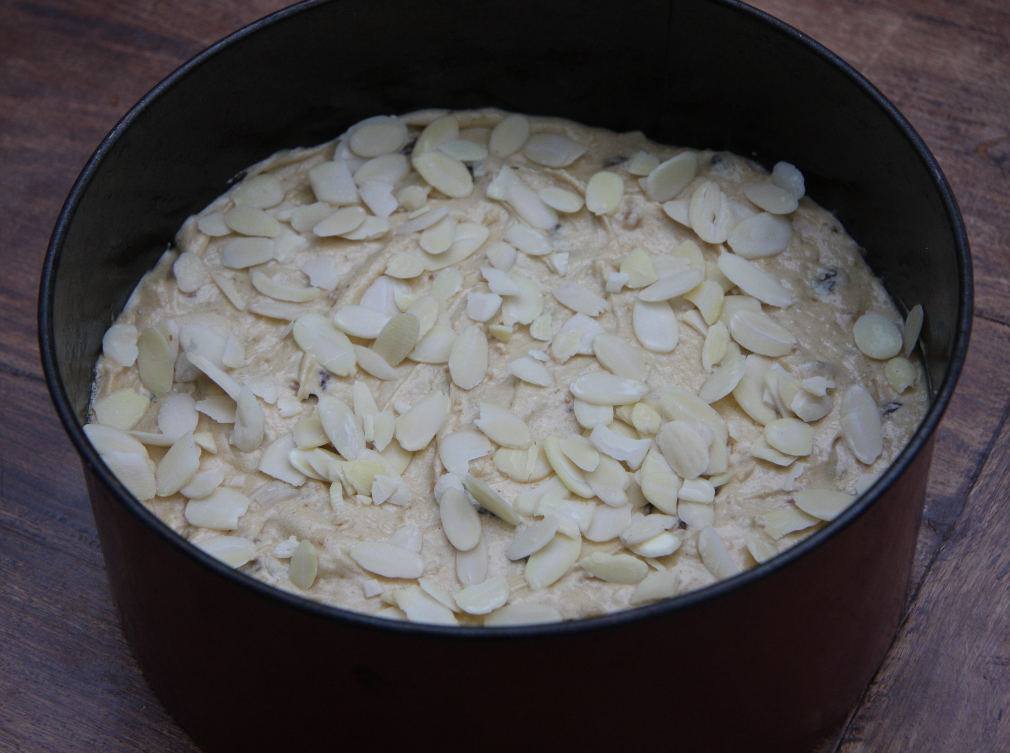 Tip the mixture into the cake tin and level gently. Sprinkle the almonds over the top.