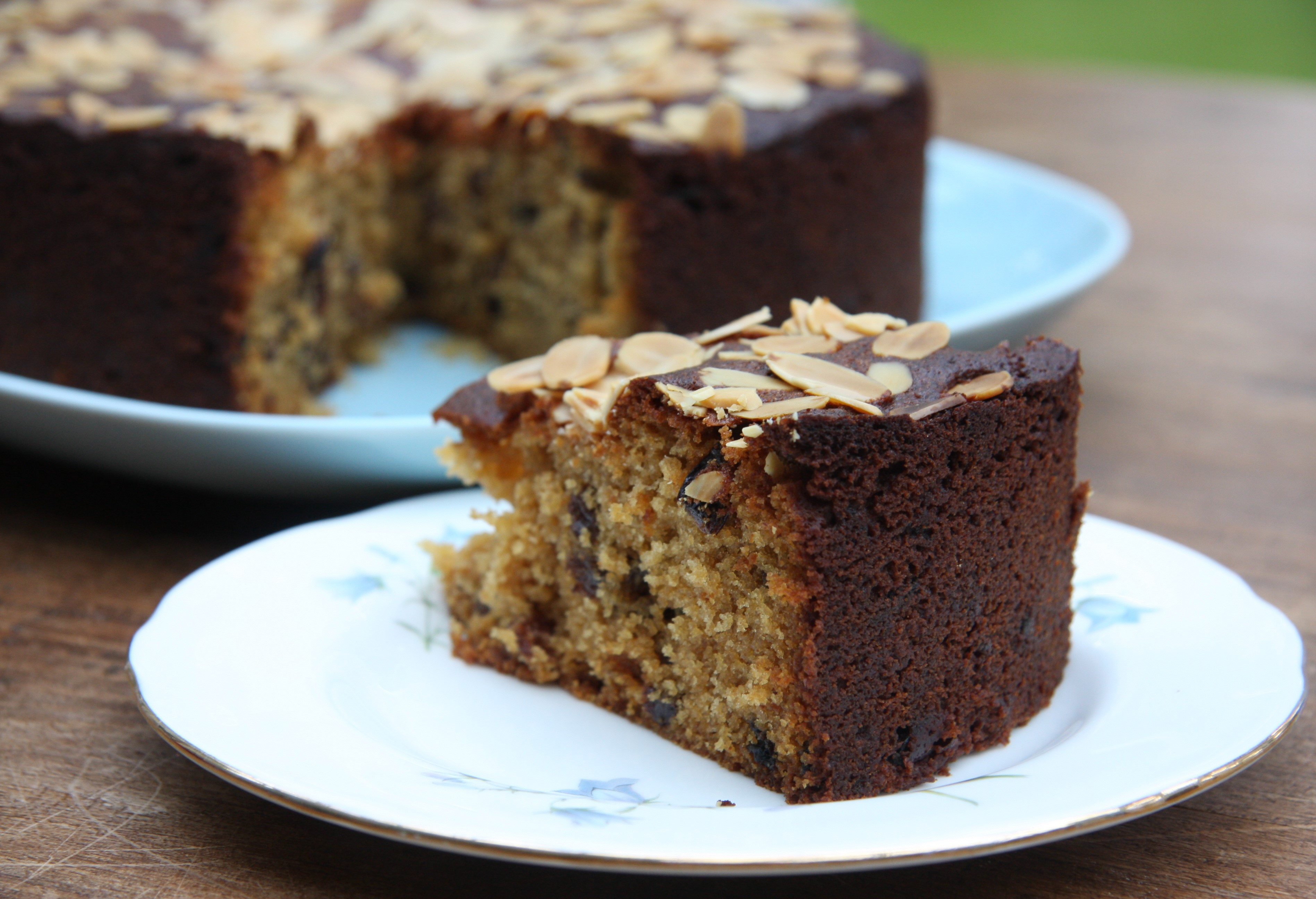 This cake takes just a few minutes to put together but needs a long, slow cooking time. I think I had my oven a little hot as the top and edges are very brown but I don’t think it matters. I covered the cake with aluminium foil towards the end of the baking time and probably should have done it sooner. Mary’s recipe is an all-in-one but I added the ingredients in stages, just to make sure they were properly mixed and the flour didn’t get overworked: you could just throw everything except the flaked almonds into the bowl and mix.