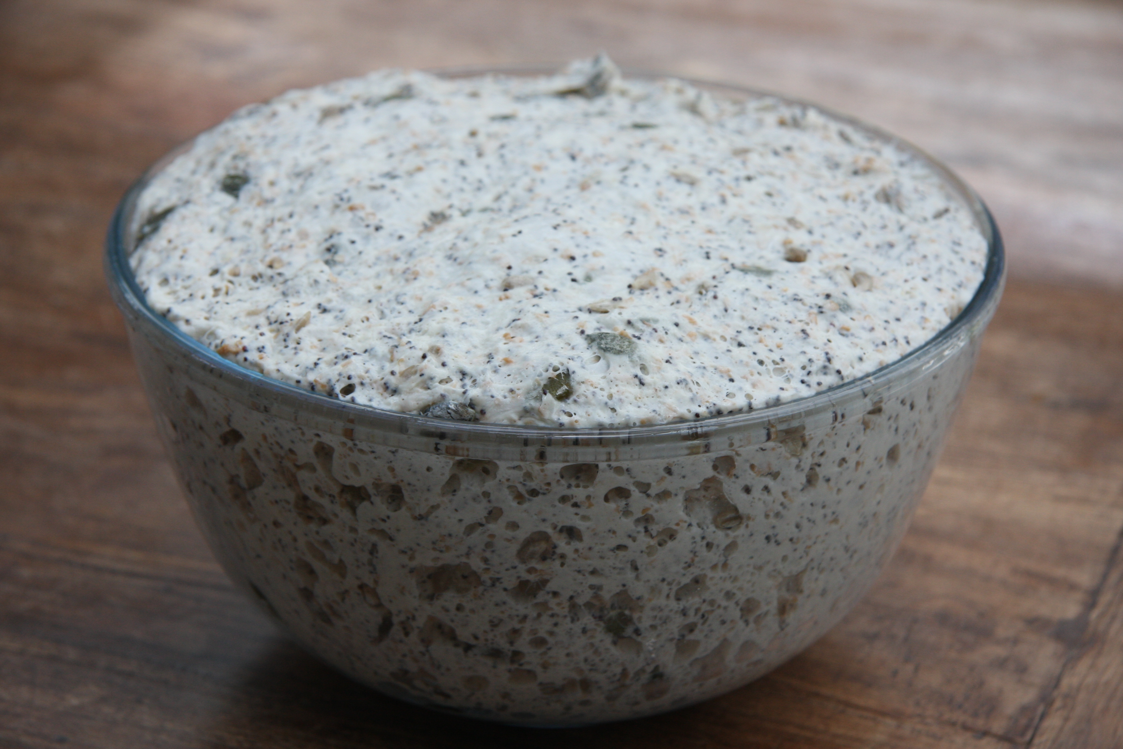 I wasn’t really sure whether to add the seeds at the very beginning of the recipe or at the end of the first rise. I thought that right at the start might be too soon and the end of the first rise might be too late: either the seeds would not get properly distributed or I would end up kneading the risen dough too much. Eventually I decided to knead the dough for about five minutes before adding the seeds and continuing to knead it until it was ready for the first rise. Which may or may not have been the right thing to do but it seemed to give a good result.