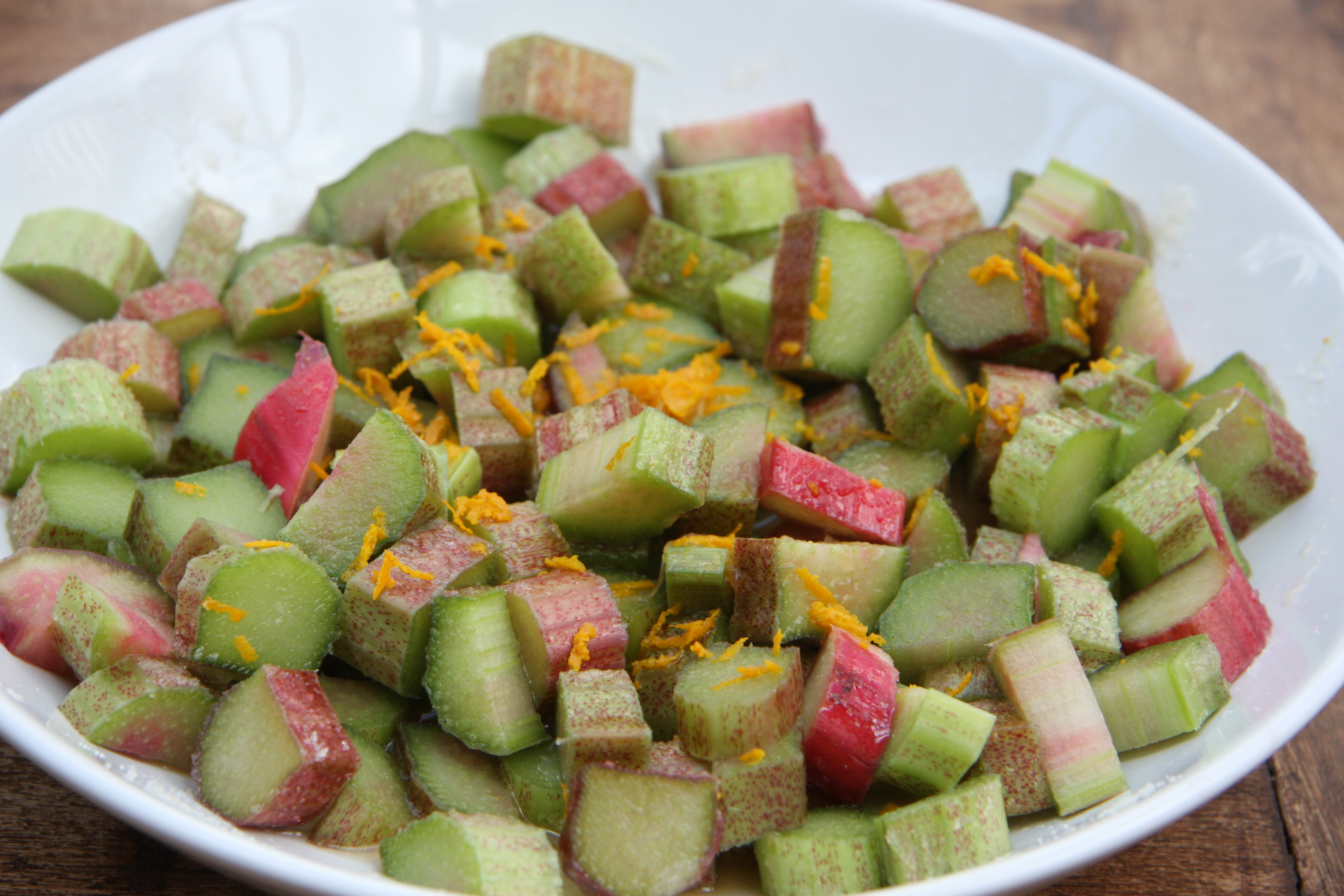 Chop the rhubarb into pieces and put into a bowl. Add the orange zest and juice and sprinkle 50g of sugar over it and mix. Leave for around 30 minutes.