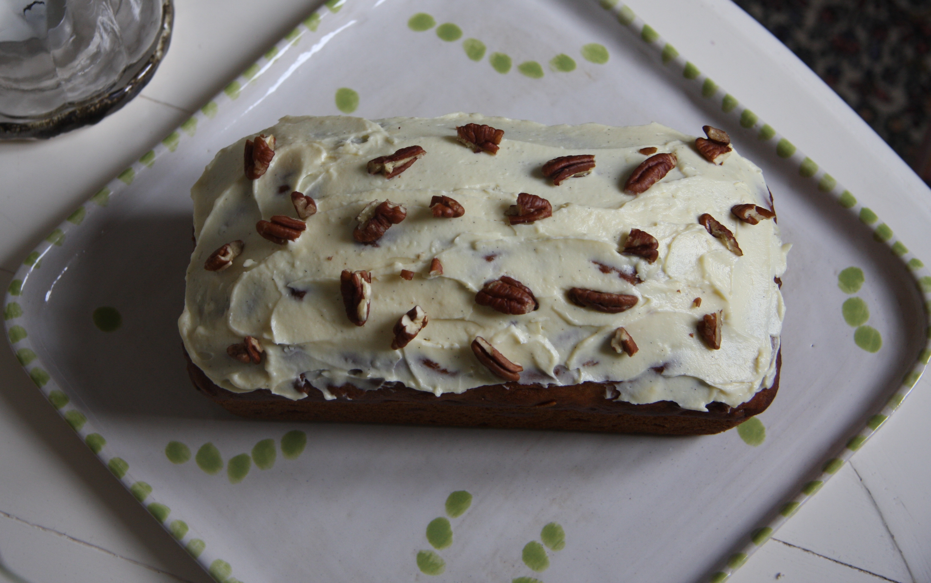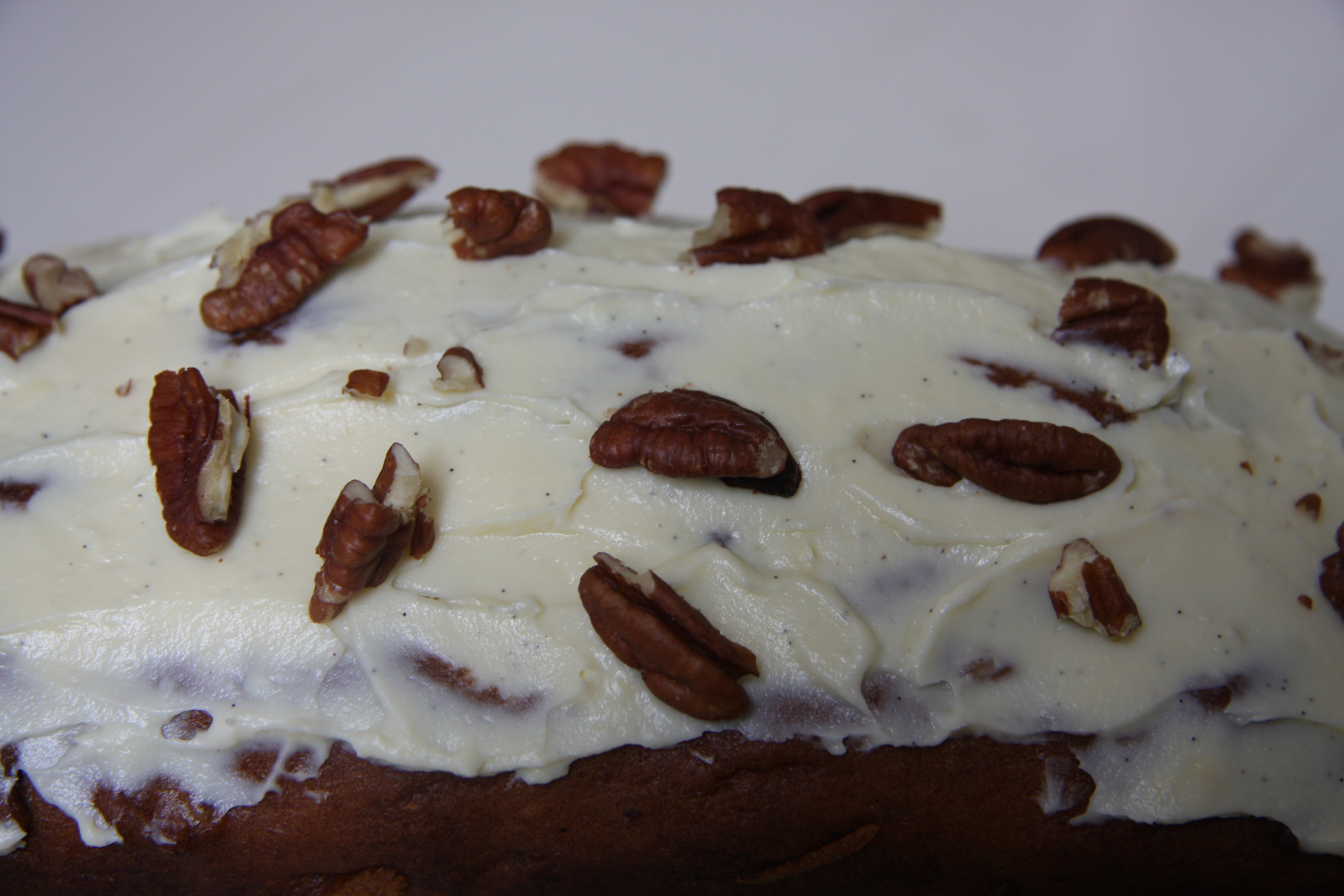 Spread your icing over the top of the loaf and add a few chopped or whole pecans to decorate.
