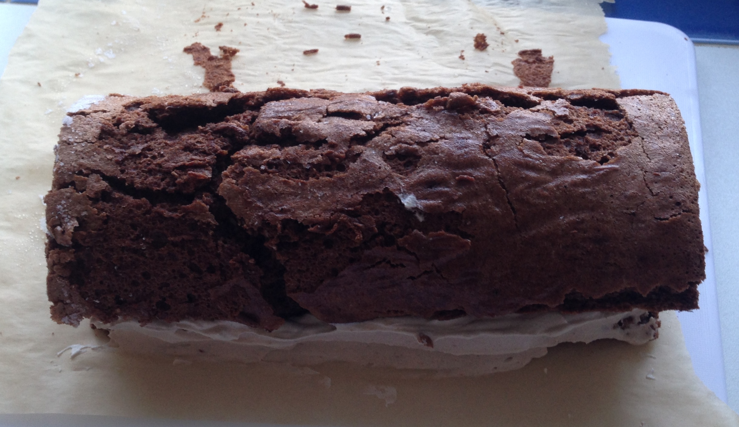 chestnut rouladeStarting from one of the short ends carefully roll up the roulade, using the paper to help. I had to almost scrape the roulade off the greaseproof paper with a knife at points while rolling it.