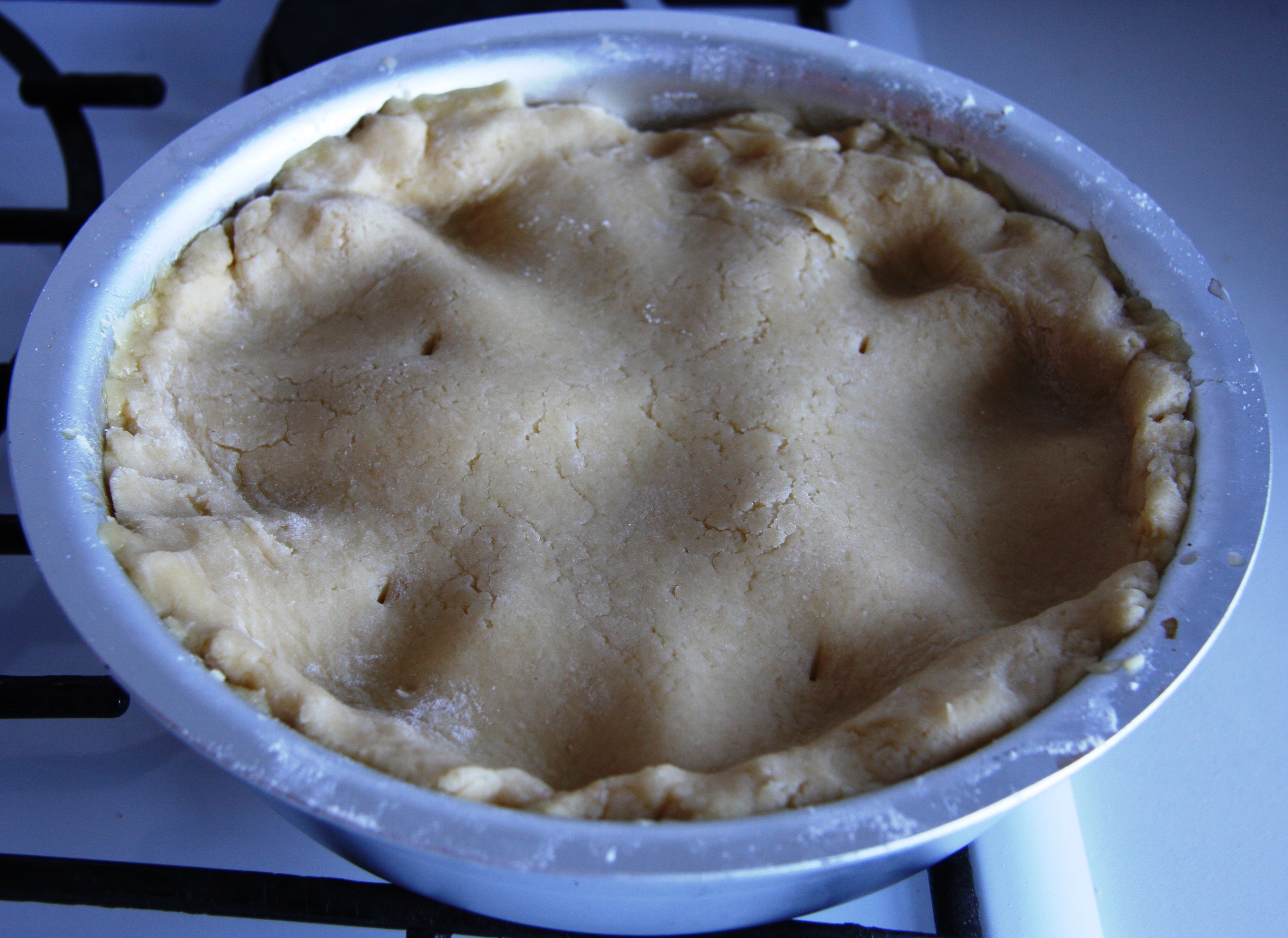 Top with the pastry and fold the edges under. Make a few small holes in the pastry: