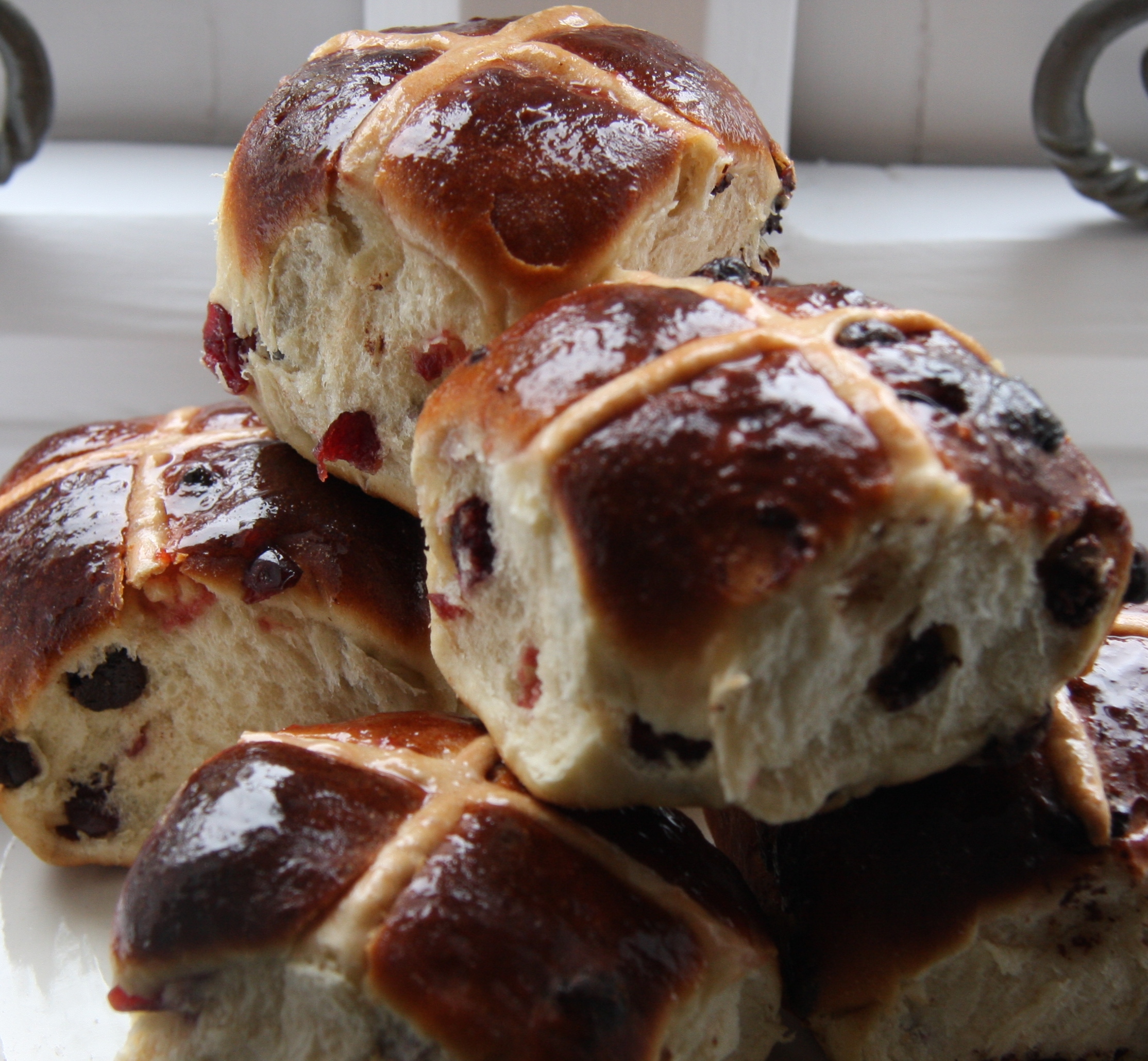 I always tell my kids that just saying something doesn’t make it true: it’s important to use your own judgement as to whether or not something is as it claims. It’s a good rule that can be applied to most things: friends, family, politicians, advertisements, the internet. Or when my 13 year old daughter tells me she absolutely, definitely isn’t wearing any make up. Even when I tell her I can see the line where the foundation ends and her beautiful young skin begins… Putting a cross on these delicious cranberry and dark chocolate chip buns won’t actually make them hot cross buns, at least not in the traditional sense. Perhaps if I had added cinnamon and mixed spice I would be more convinced as I have no problem adding dried apricots and cranberries to a traditional mix. Somehow the chocolate takes them into a different realm. Next time I make them I will be leaving the crosses off: the main advantage to that is they can be enjoyed at any time of the year, they are not just limited to Easter!