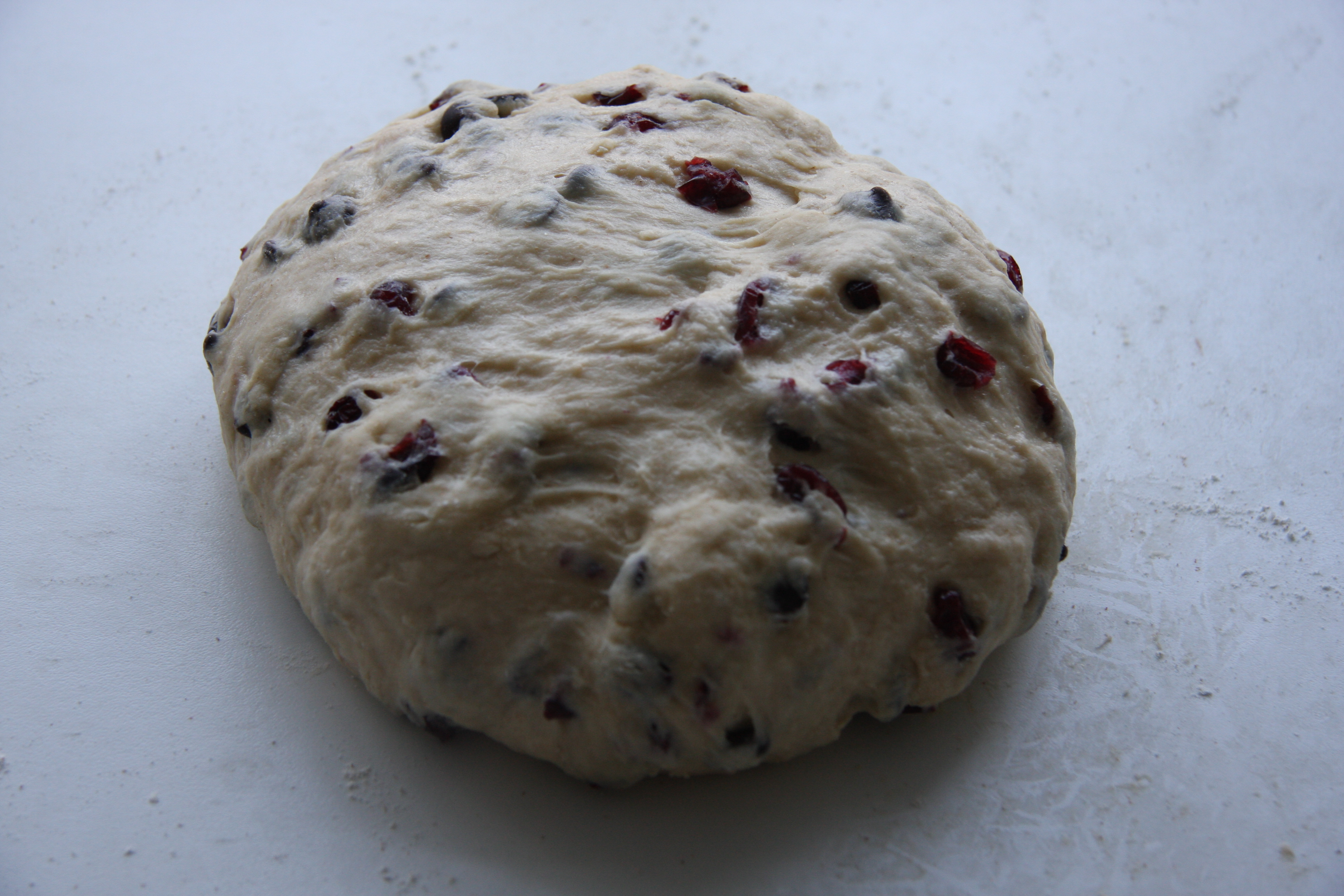 Tip the dough out onto a floured surface. Flatten the dough out and cover with the dried cranberries and chocolate chips.
