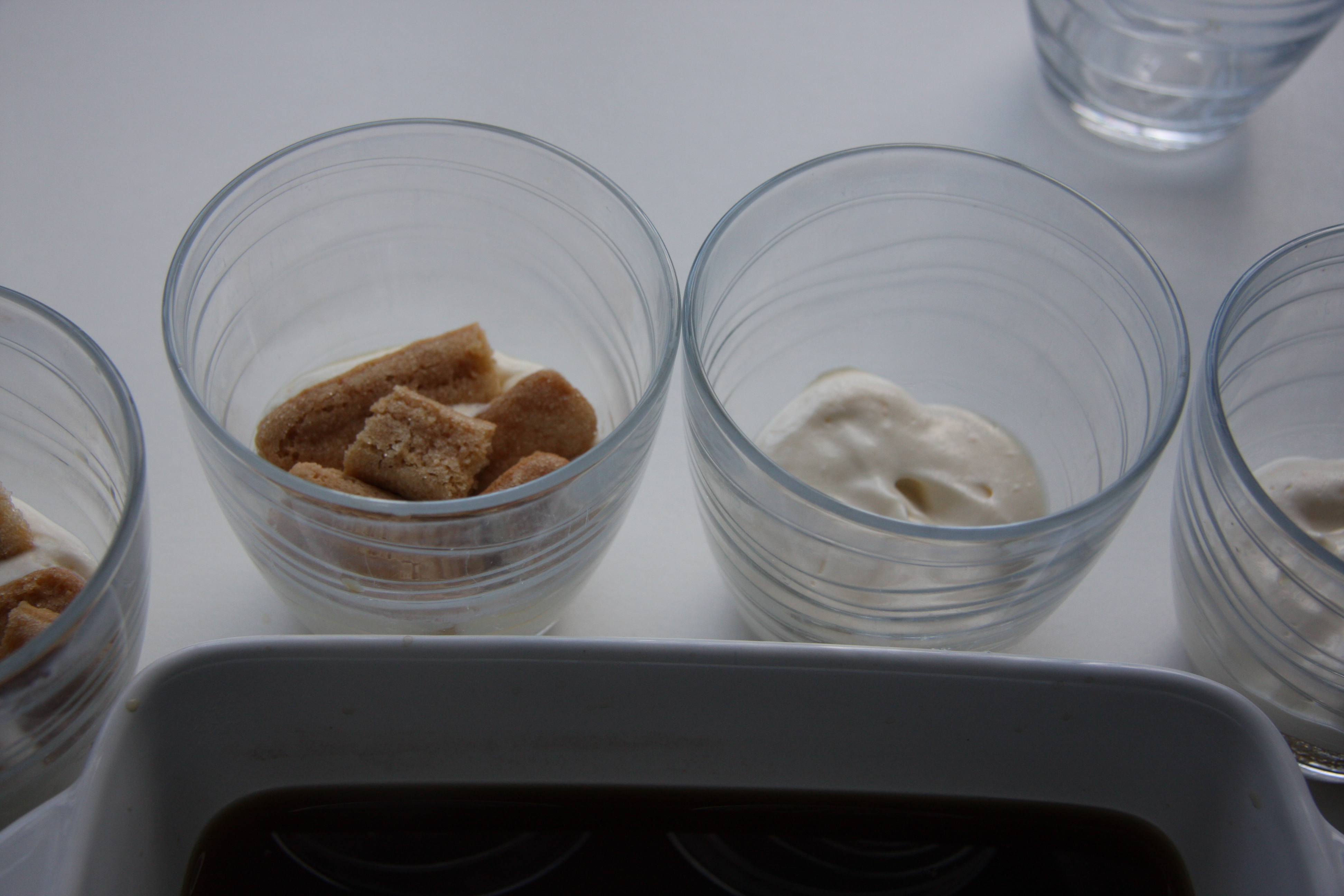 Then add the next layer of biscuits in the same way, by dipping them in the coffee mixture and arranging them on top, either in the dish or individual pots: