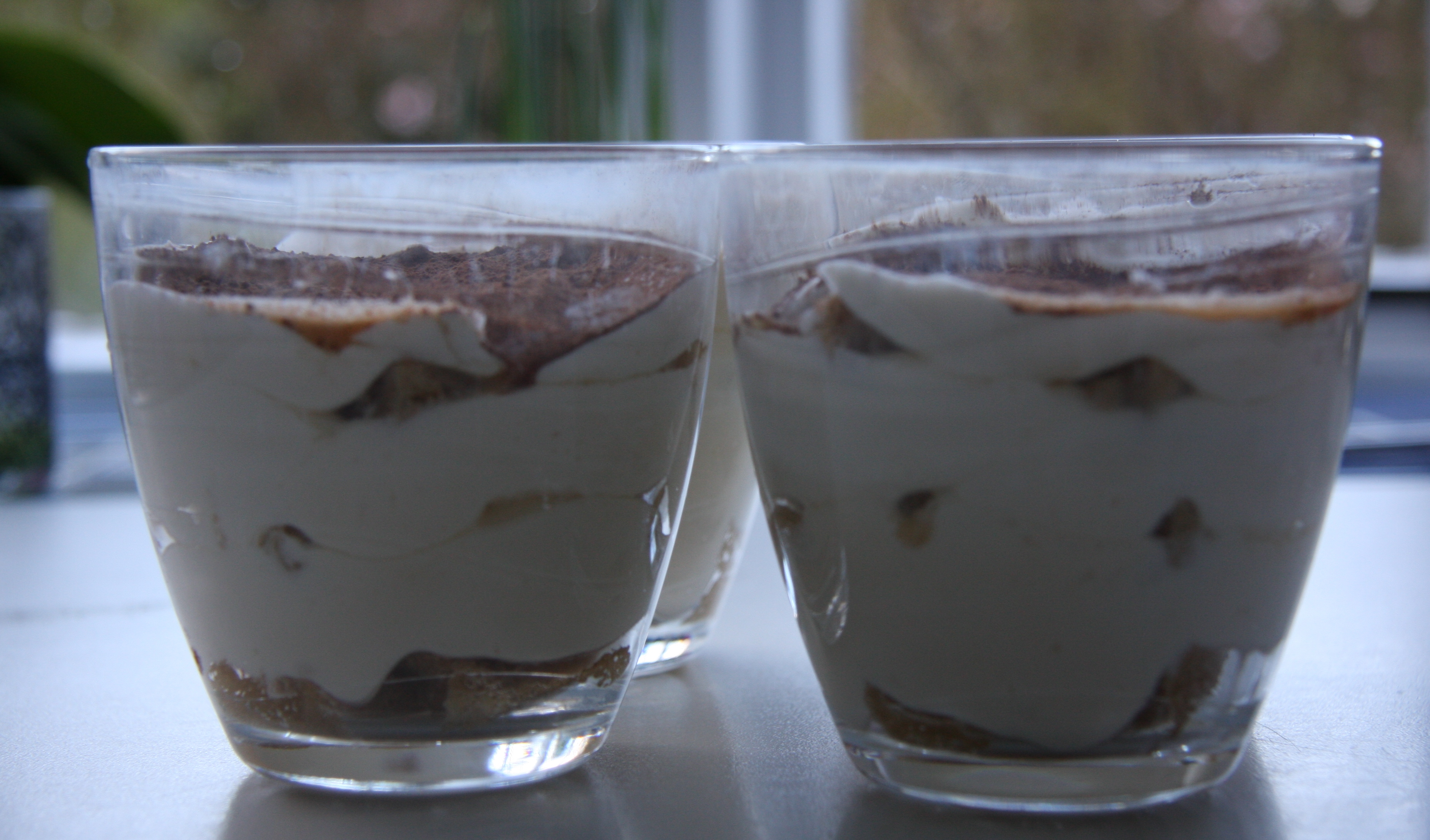 homemade tiramisuI always worry that I will make my tiramisù either too wet or too dry but I think it is pretty much foolproof. Make sure the biscuits get wet but not soaked through: if they start to turn to mush before you get them out of the coffee they are too wet so take them out more quickly. I put them in the coffee mixture, turn them over and take them out. It’s a good idea to use a smaller amount of coffee and brandy to start with and refill your dish if necessary than to overfill it from the start. I made a small cafetière of strong coffee (but didn’t use the whole amount) and how much brandy or marsala you put in is of course up to you: I used between two and three tablespoons of marsala, rather than brandy, as it is less strong and I knew the kids would be eating it.