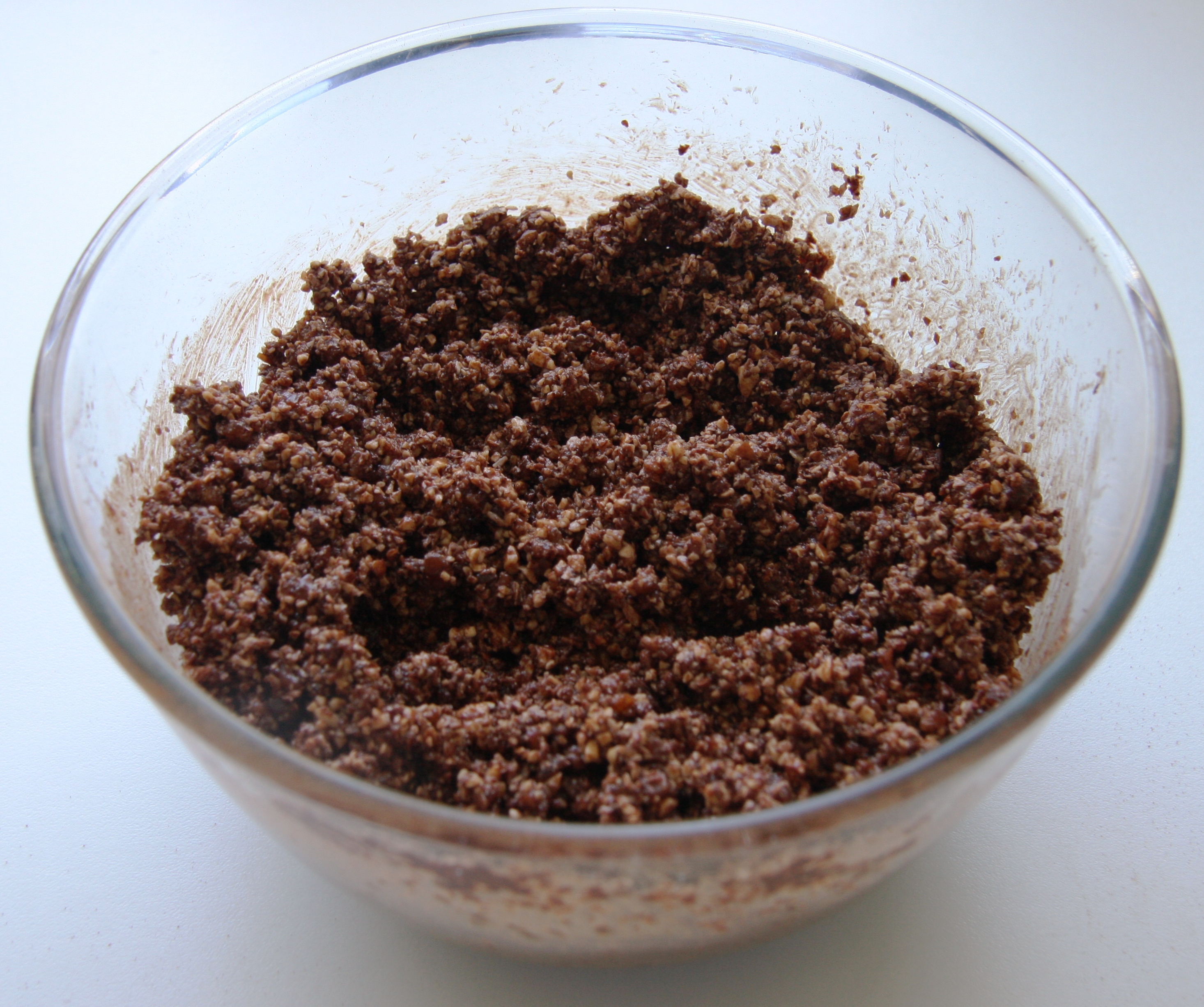 Put the dates and dessicated coconut into the food processor and process until they are also finely chopped: add to the bowl with the chopped nuts.