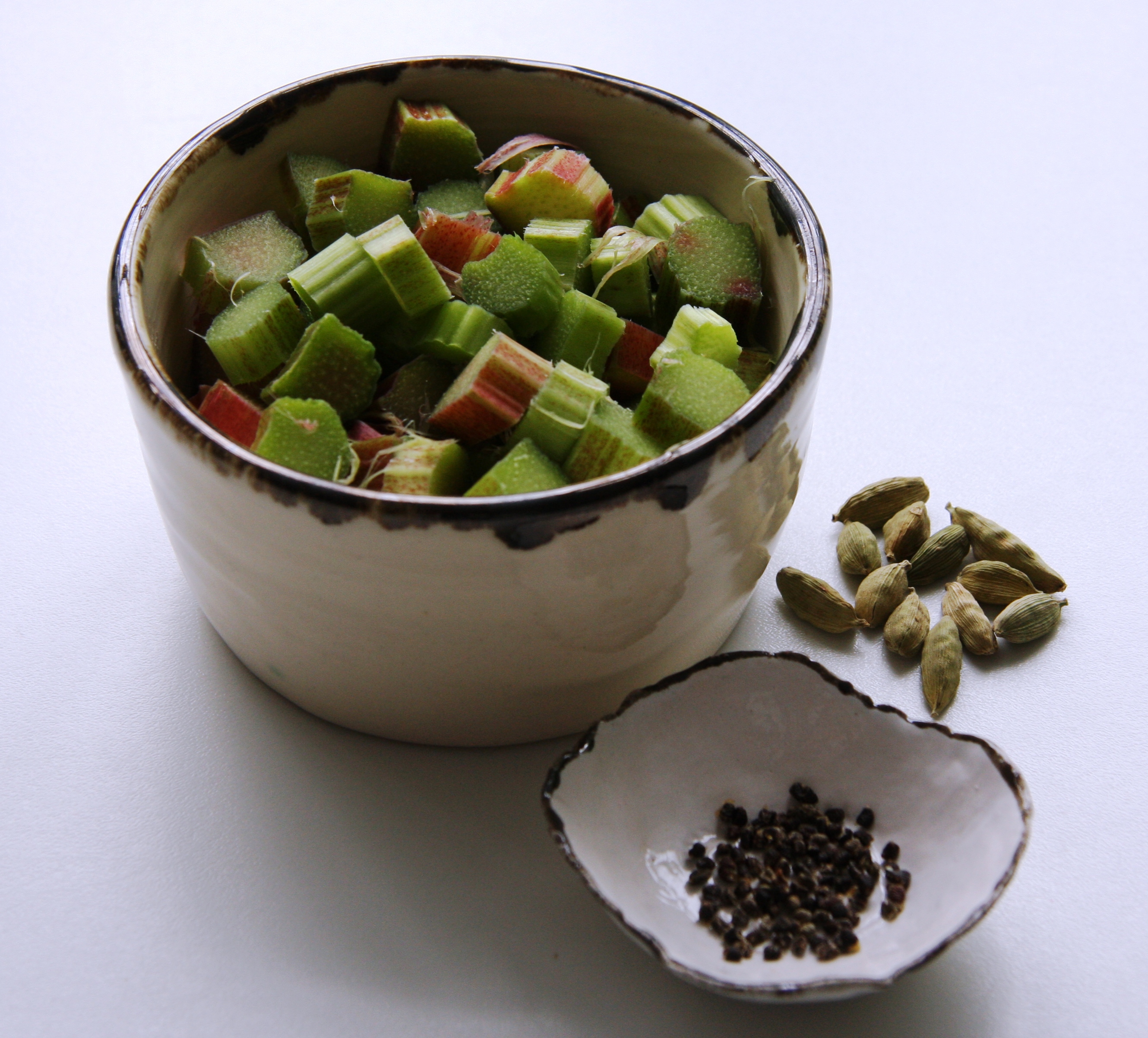 Mix in the rhubarb, pistachios and cardamom seeds.