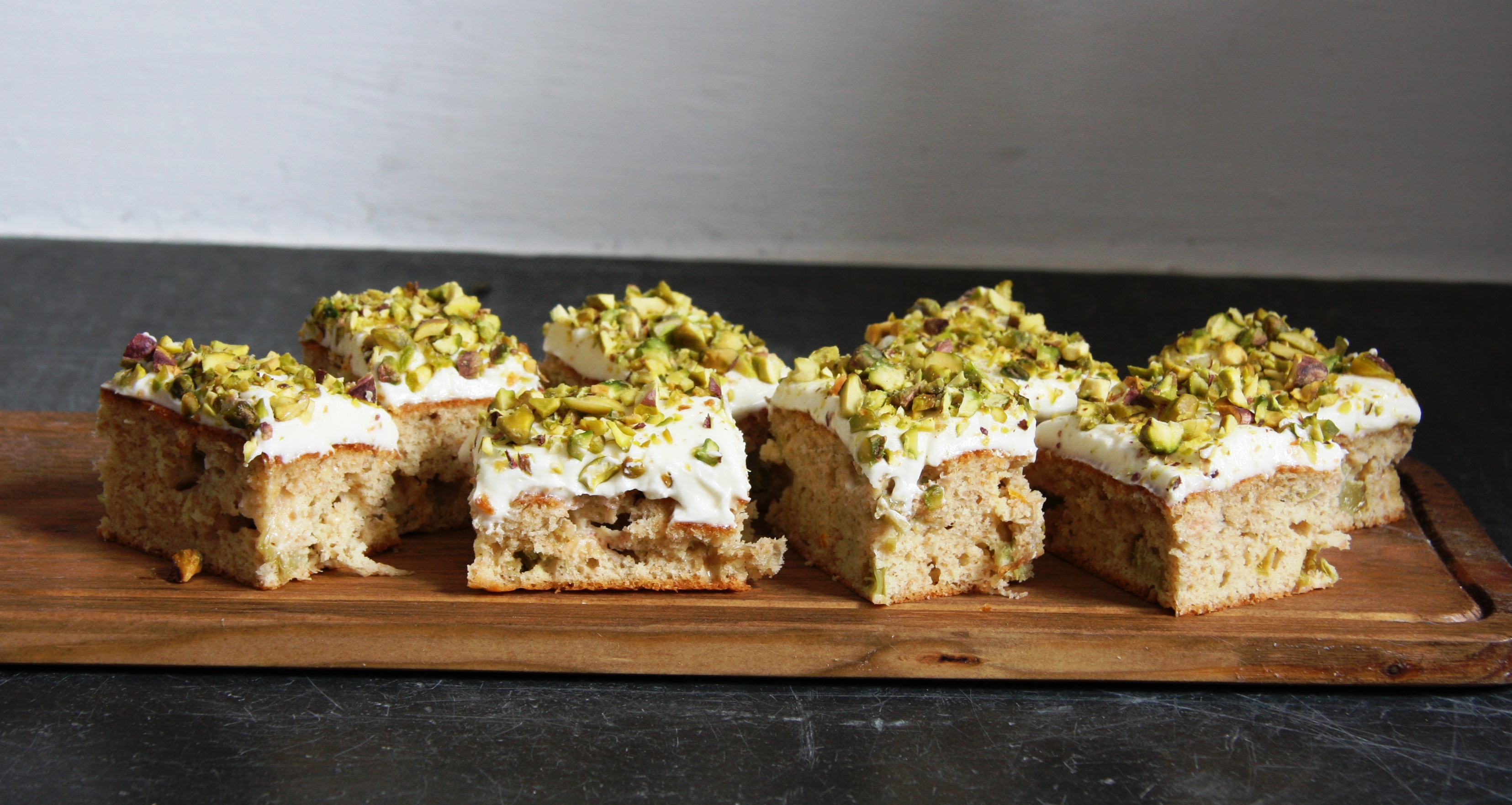 My parent’s rhubarb crop is nearing the end but that didn’t stop them giving me a large bunch to take with me when I visited recently. It made a great crumble and this cake, which was my second attempt at my friend Magda’s recipe. The first time I forgot to check whether I had cardamom until it was time to add it (turned out I didn’t) and forgot to put in the ginger. Oh, and the butter. It wasn’t a runaway success. This time I made sure I had all the ingredients and double-checked I had put them in. And despite reading the recipe numerous times before making it, making the cake twice and wondering repeatedly why you didn’t put the pistachios in the cake as well as on top, still managed to miss the part in the recipe where it said add the pistachios until I came to write this. So the next time I make it I’m hoping to get all the ingredients in…