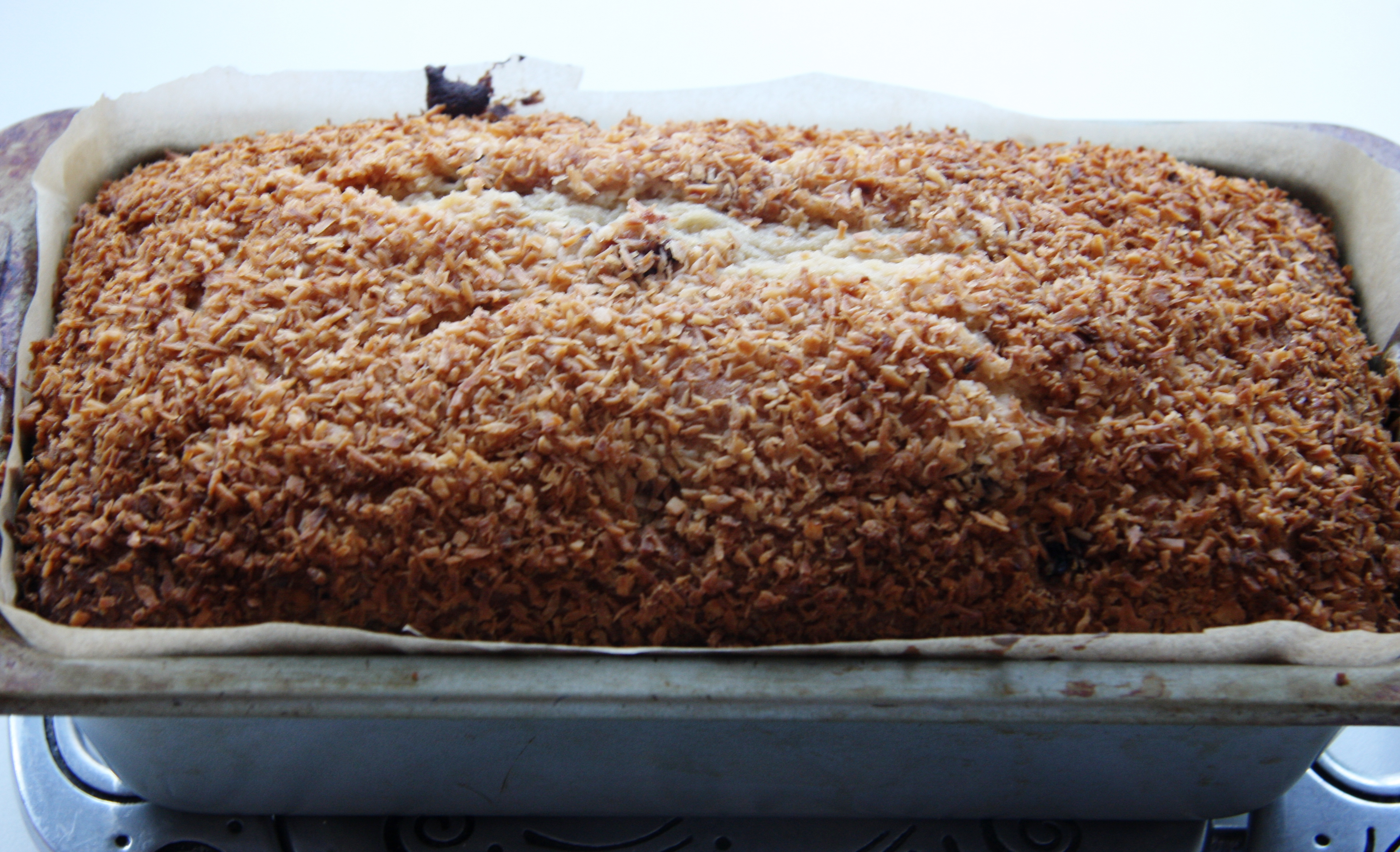 Bake for around 50-60 minutes but check it after about 40 minutes. If the coconut is browning too quickly cover the loaf with aluminium foil. The loaf is ready when it is well browned, firm to the touch and a skewer inserted into the middle comes out clean.