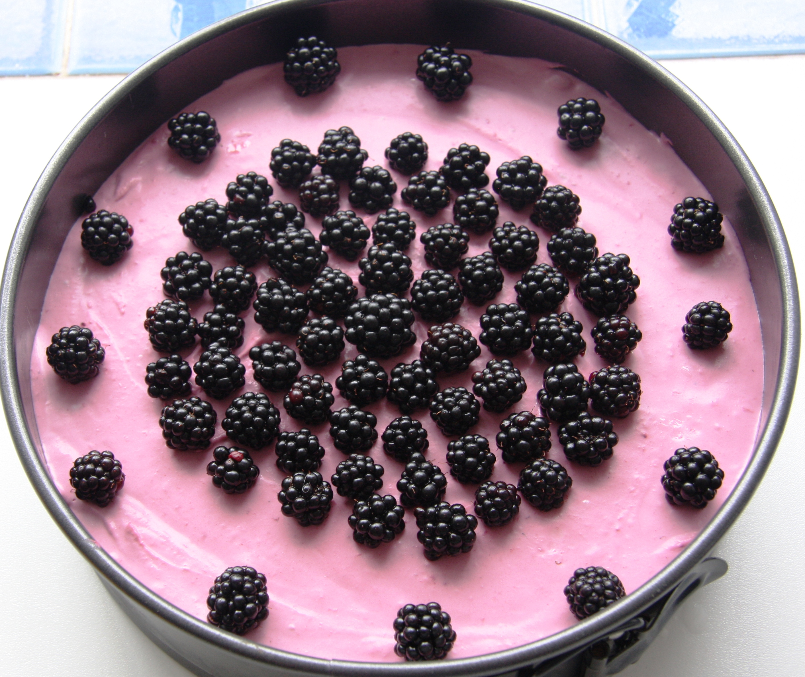 Tip the blackberry mixture onto the biscuit base and level. Make sure the mixture reaches the sides properly or you may get gaps when you remove the side of the tin.