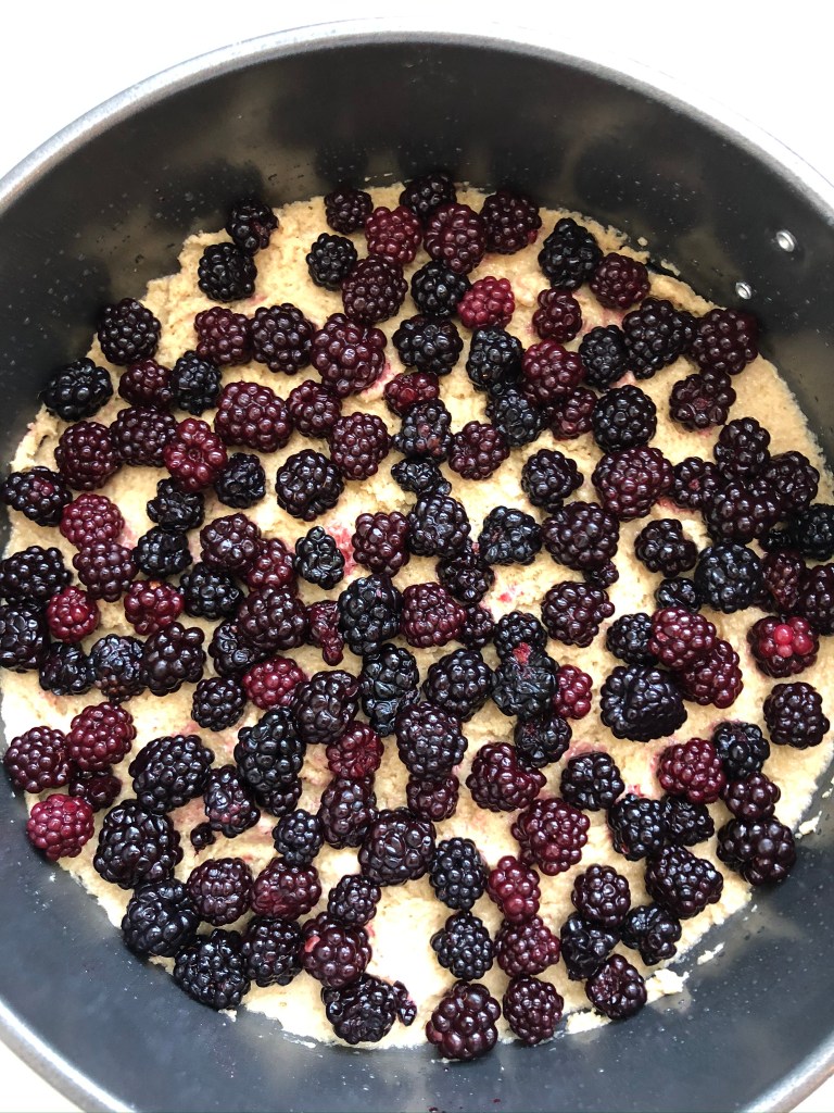 Add the remaining cake mixture and carefully smooth out again – try to avoid pulling up the blackberries.