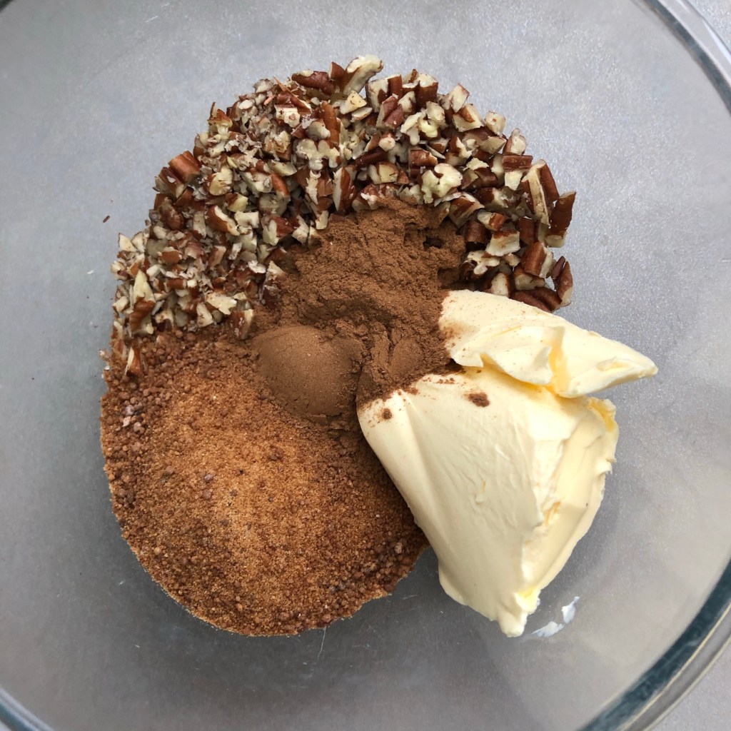 Make the filling: mix the chopped pecans, softened dairy-free margarine, sugar and cinnamon together to form a spreadable paste.