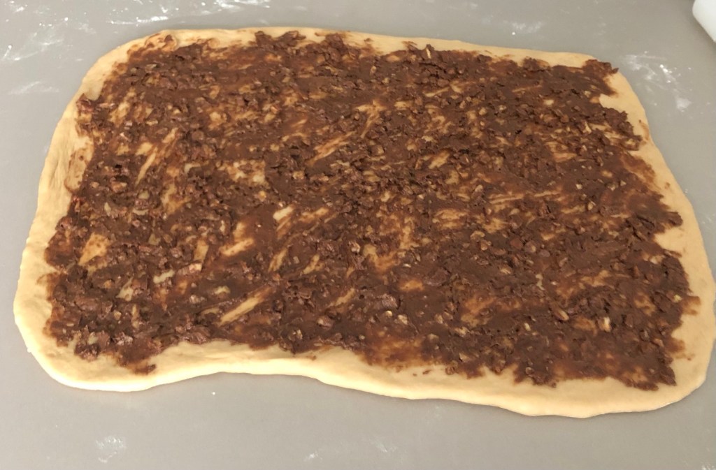 Spread the pecan and cinnamon mixture evenly over the dough, almost to the edges.