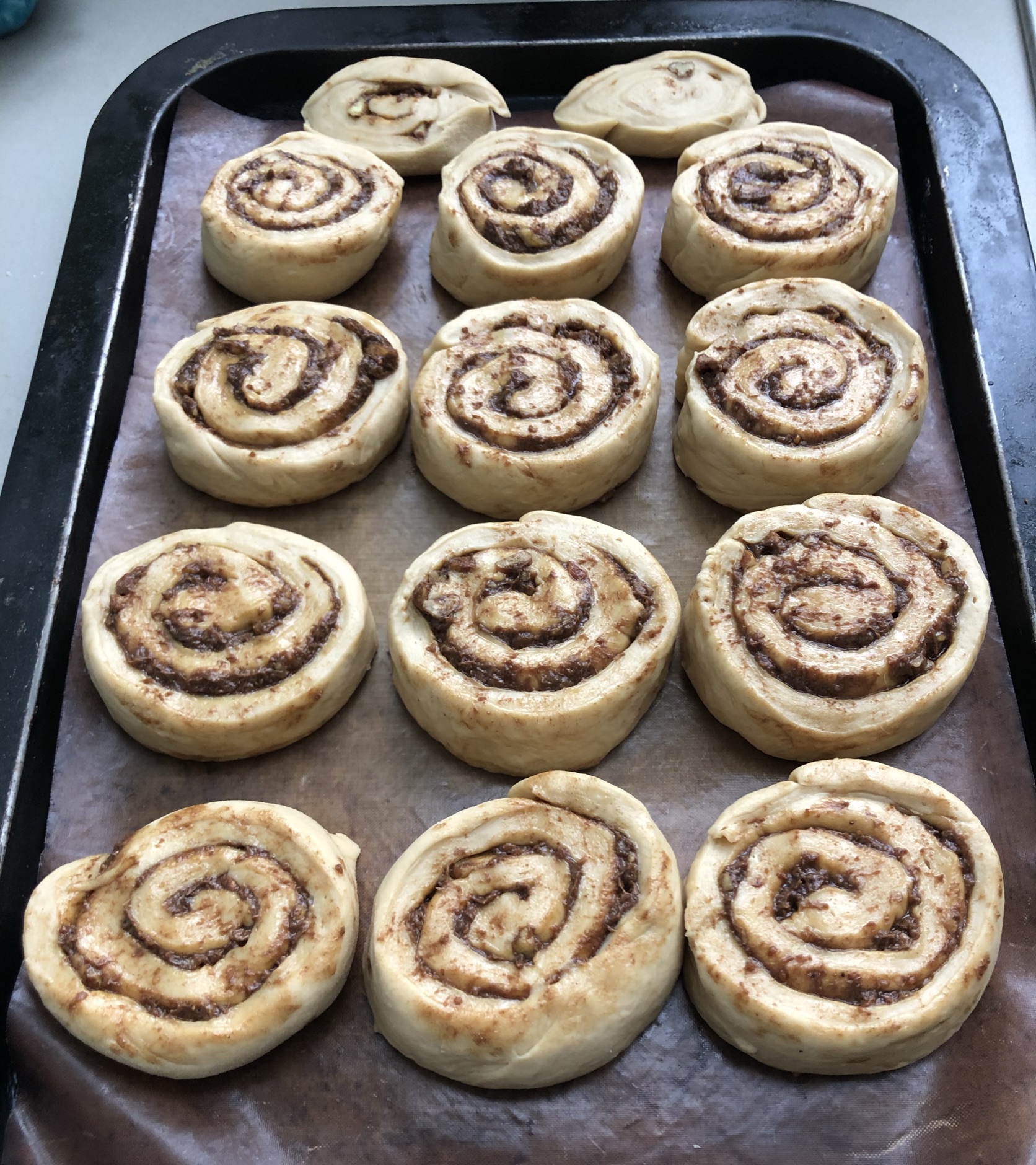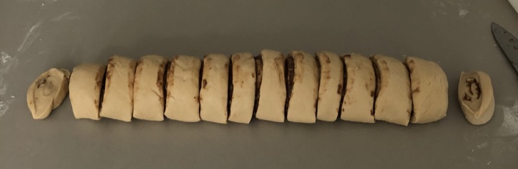 Roll the dough up lengthways and cut off the very end pieces. Cut into 12 equal sized pieces